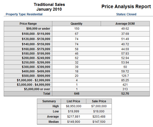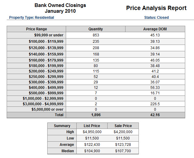 Let’s compare the price breakdown of all bank-owned properties in the Greater Las Vegas Area that closed in January 2010 with the Classic or Traditional Closings as well as the increasing Short Sales. First here is the price analysis of bank-owned closings:
