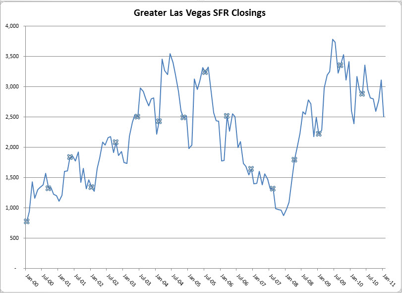 Single family residential (SFR) closings for January were down 3.8% from December 2010 but at 2509 closings it is still the second best January on record. The median sales price of an SFR dropped to $125,350 for a decline of 5% from December. REO sales at the lower price points dominated January sales activity and contributed to the downward price pressure. Here is a “stock market” look at Greater Las Vegas SFR closings.