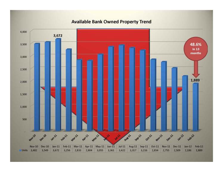 Single family residential (SFR) closings for January ended up 16% less than December but up 16% from January 2011. The most significant changes can be seen in the shift from REO closings to short sales and traditional sales. The continued decline can be seen in the trend chart below!