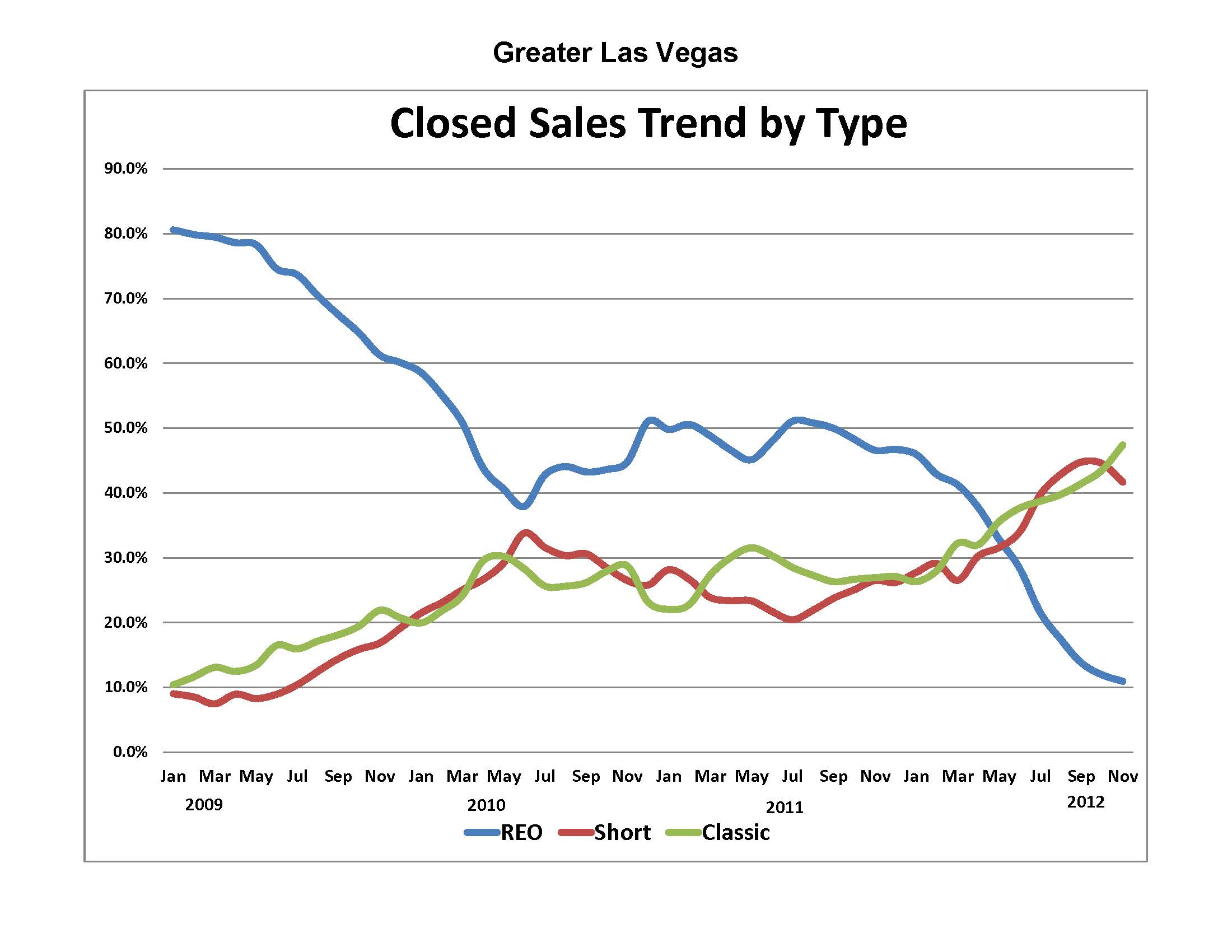 Single family residential (SFR) closings for November 2012 were down 11% from October 2012 as well as being down 15.8% from November 2011. Overall inventory is hovering around the 5400 unit mark. Despite having about six weeks of inventory in most areas of Greater Las Vegas, we have taken the fewest listings in 2012 compared to the past five years. Has the dramatic shift to a traditional listing market caused listing agents to be off their game? The good news is that median price of an SFR increased by 4.3% to $146,000.