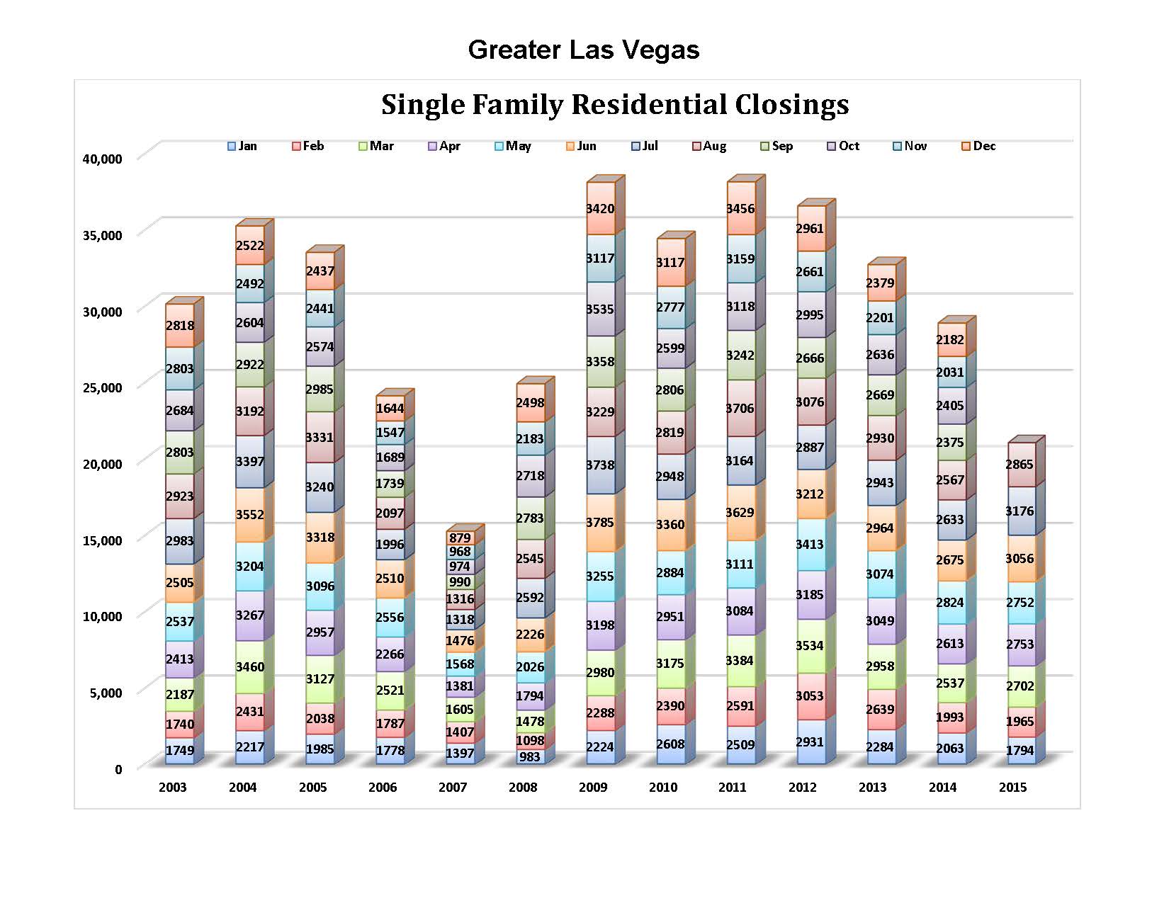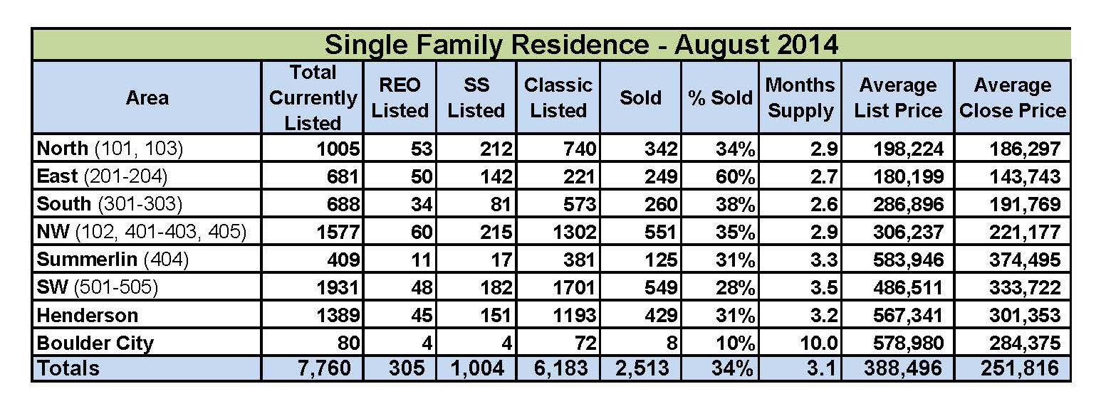 August SFR closings were down 9.8% over July but nearly 12% higher than August 2014. The median sales price of an SFR improved to $220,000, while the average price inched up to $262,215 for a 1.4% increase over last month. This is the new “normal” for the Greater Las Vegas market. It’s slow, steady, but not sexy growth. That’s just fine! Embrace the sanity that comes with this market and let’s just hope it continues in this relatively boring manner for several more years!