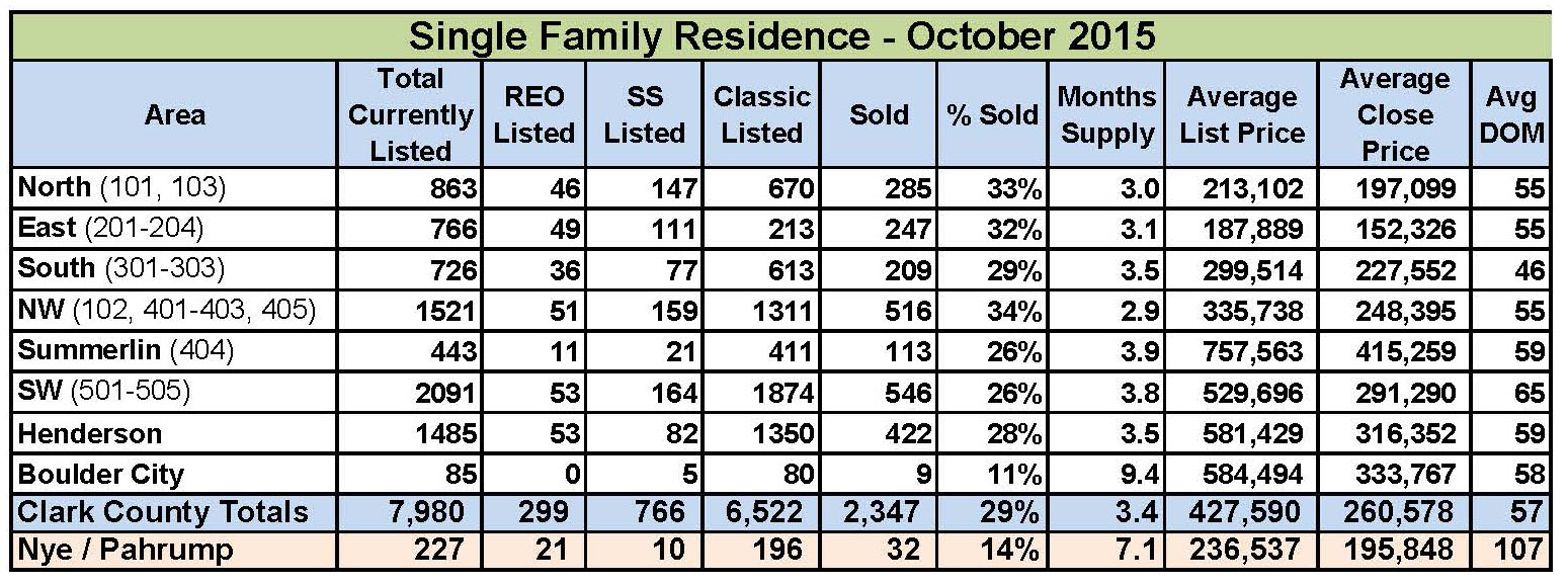 October SFR closings were down 10.$% from September but rose 20% from October 2014. The median sales price of an SFR remains at $220,000, while the average price edged up to $259,239. Again this is the new “normal” for the Greater Las Vegas market. It’s slow, steady, but not sexy growth. Some even call it boring, but that’s just fine! Embrace the sanity that comes with this market and let’s just hope it continues in this relatively boring manner for several more years!