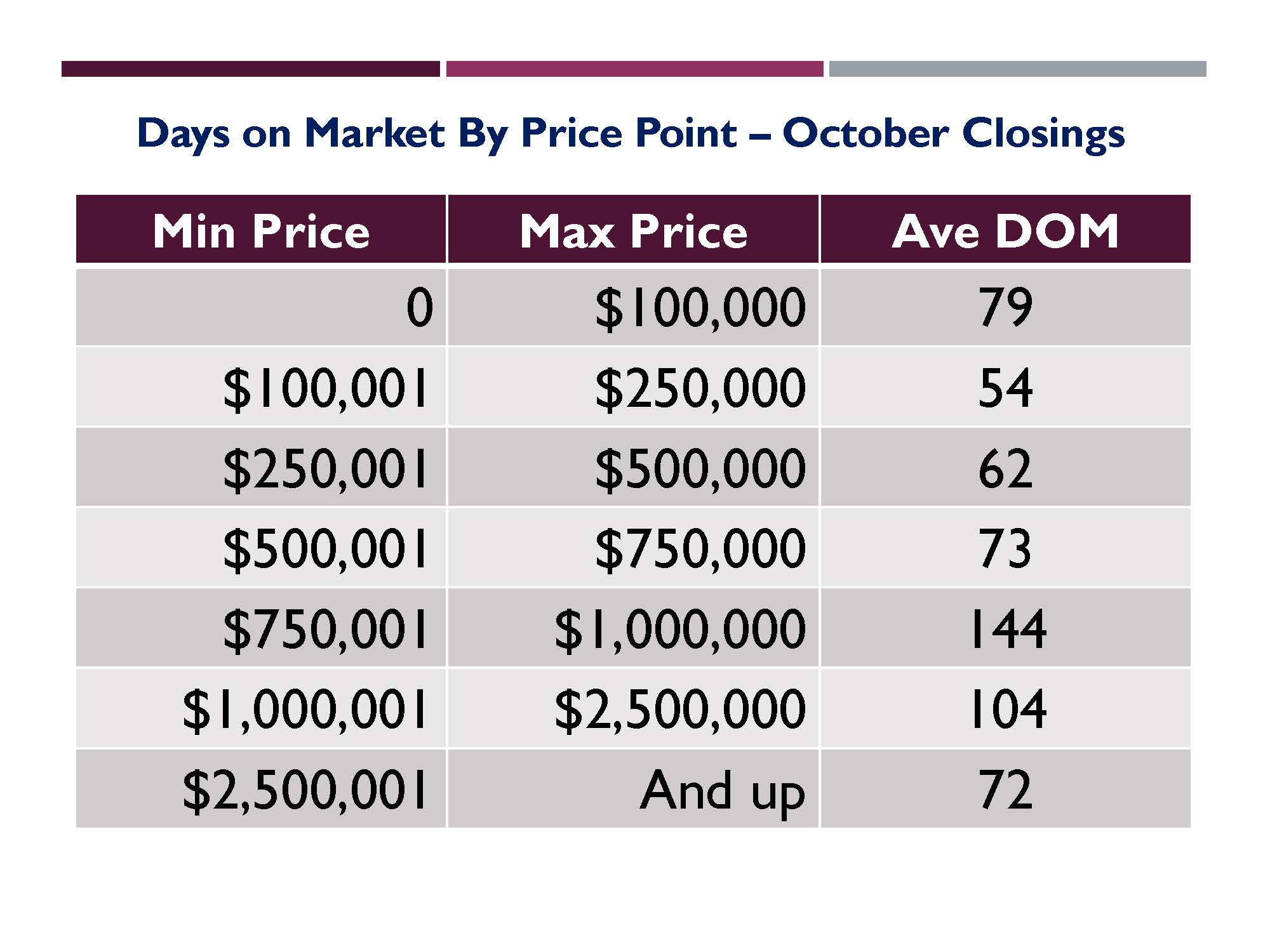 Just a note on inventory levels! The numbers provided in these stats look at large areas and do not take price points into consideration. For example, Seven Hills has about four months of overall inventory, but more than ten months of inventory in the luxury end of the market. Thus, it is necessary to consider price points when preparing a Comparable Market Analysis (CMA) in order to properly determine how supply and demand are playing out at the different price points. Here is a chart that partially illustrates this point by looking at Days on Market by price point: