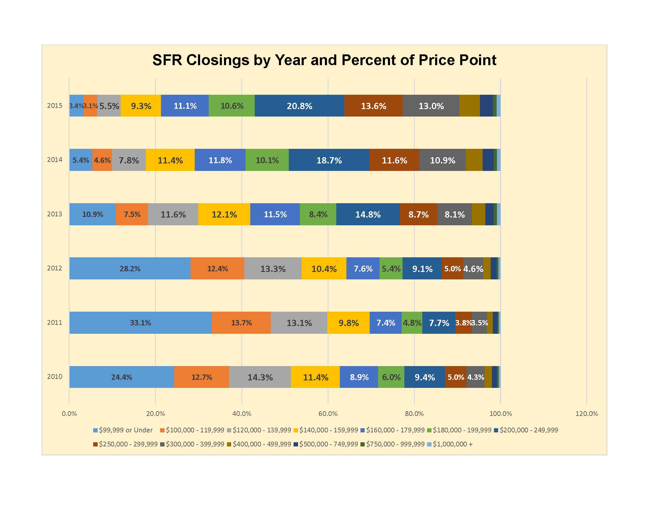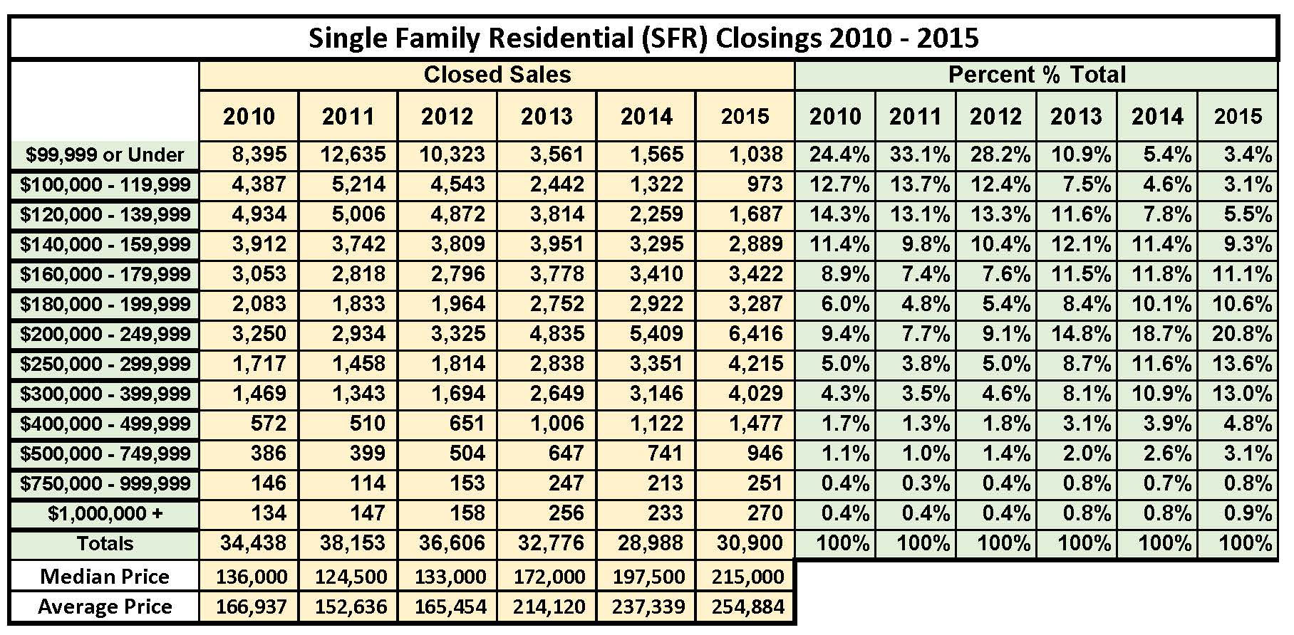 The next few graphs and charts illustrate the movement of closed sales by price point. For example, we see that in 2011 over 33% of the closings were under $100,000 – but that has dropped to nearly 3% in 2015. You may want to click on each item below to see a larger, more readable version.