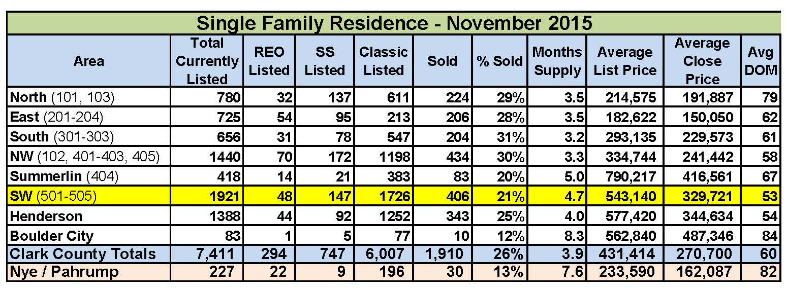 We stated earlier that prices dropped roughly 6% just this past month. Consequently, I’m already getting calls asking me about the possibility of another market crash or bubble bursting! OMG! The naysayers – glass half empty folks are already poised for bad news! We also saw that SFR closings were up just over 700 units. So, let’s compare Southwest closings for November and December. They were up over 200 units in that area alone, but with an average sales price $36,000 lower per unit than in November. The point is that the drop in market values for December are not uniformly spread across the entire Greater Las Vegas market area. In fact, check out the East and there we see a price increase. All real estate is local, so please do not be distracted by negative articles selling gloom and doom predictions. It’s good for ratings and sales, but it’s simply not REALITY!