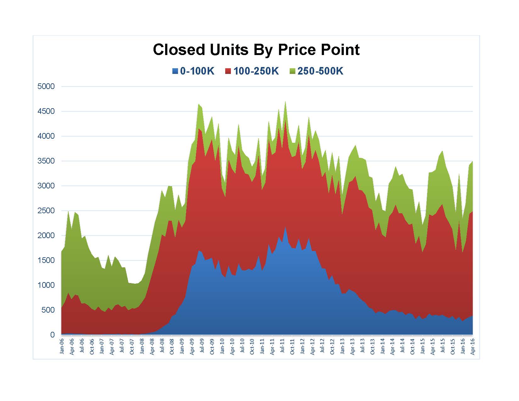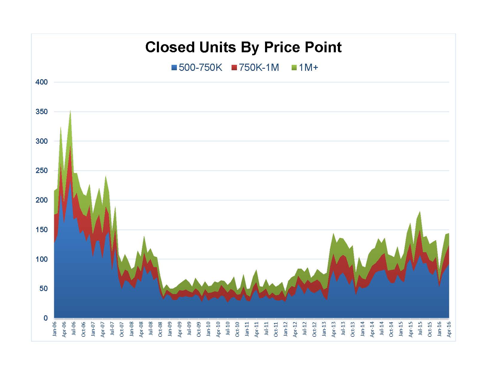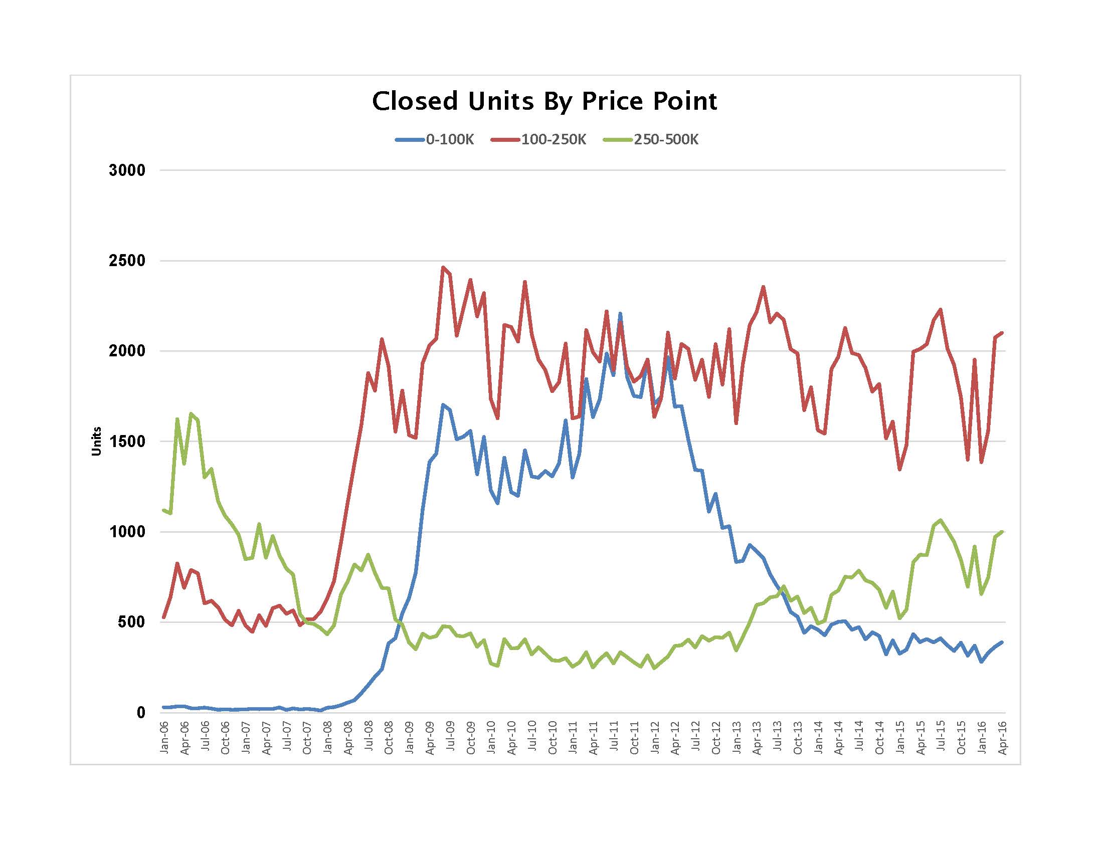 Both reports and charts were given a makeover this month, in part due to the transition from Fusion to Matrix. Some of my favorite statistics used features that are in Fusion but not in Matrix. However, every challenge is merely an opportunity in disguise. Therefore, Matrix offered some unique features not found in Fusion – and they became most helpful. Also, the market has changed to the point where there is less reason to focus as much detail on distress property listings and sales. One of new features assists in providing these next few charts where we can look at closed sales by price points to see the price point shift in the market. Here they are illustrating how sales have behaved over the past ten years based on the price bands that were chosen:
