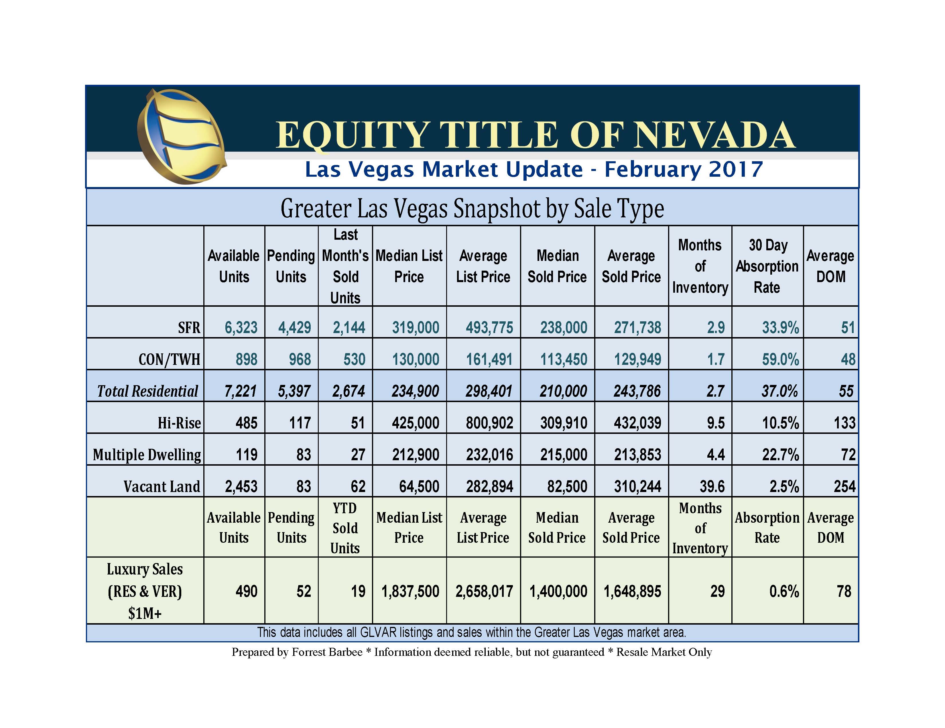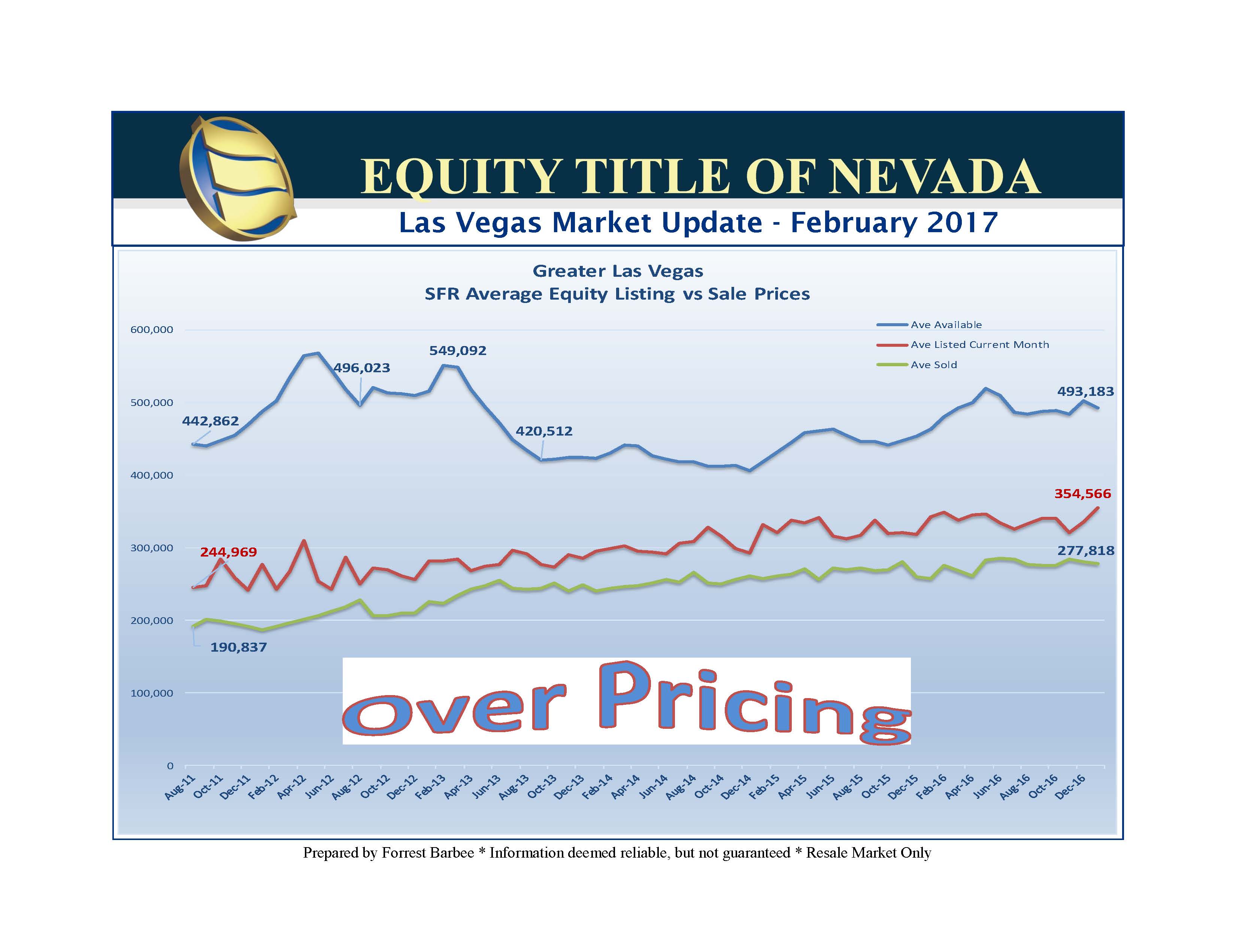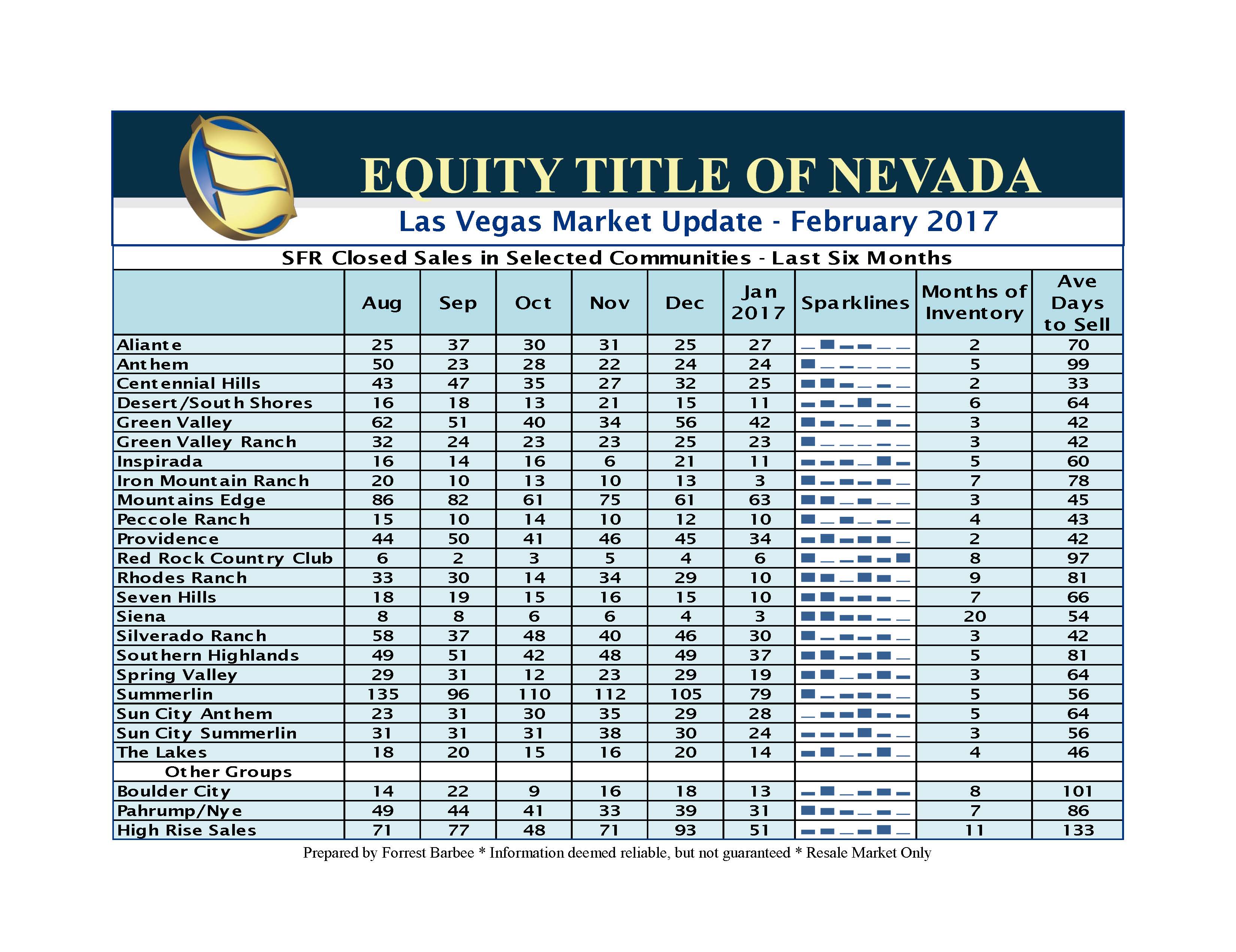 The chart below clearly illustrates that closed sales were not consistent across Greater Las Vegas this past month. For example, Spring Valley, Inspirada, and Iron Mountain Ranch all witnessed pronounced decreases in closed sales – even as Aliante and Mountain’s edge saw slight improvement. Therefore, depending on the community, months of inventory for SFR homes ranges from 2 to 20 months. It’s also clear that some communities had very short average days on the market (most notably Centennial Hills), while others such as Anthem Country Club and Red Rock Country Club were just shy of 100 days average on the market. Some of that also suggests that some of the older inventory closed this past month. That can also been seen by the drop in the average list price for available SFRs!