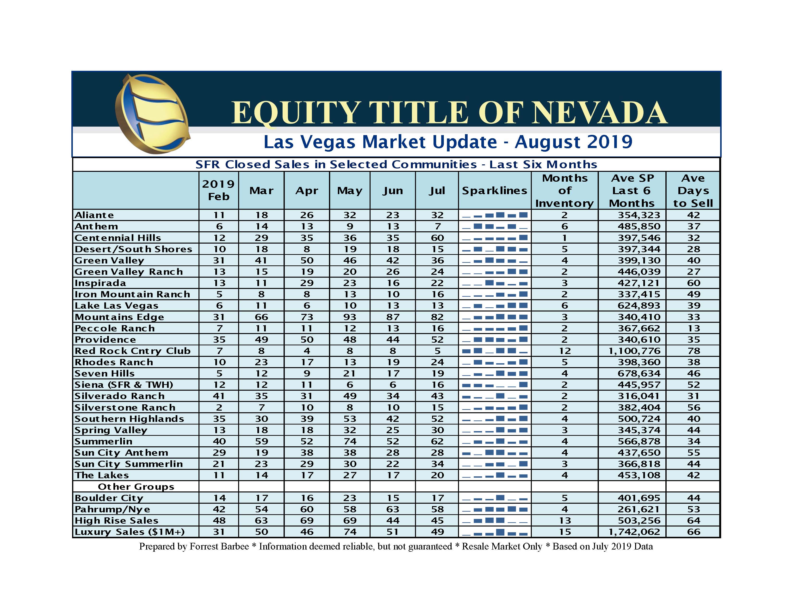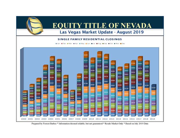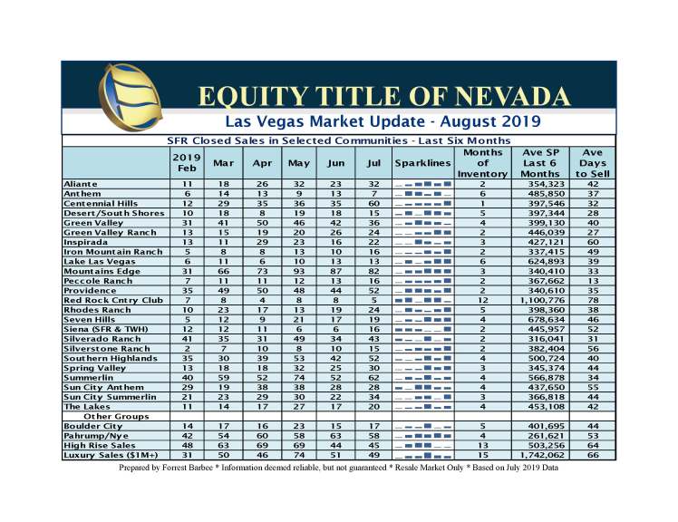 July 2019 closings improved slightly over last month but could not catch up to July 2018. The overall market remains weak except for the luxury market segment which remains strong .The Greater Las Vegas residential real estate market continues to lag just over 7% from last year. Meanwhile, the high rise market segment continues its lackluster trend with no improvement in sight.