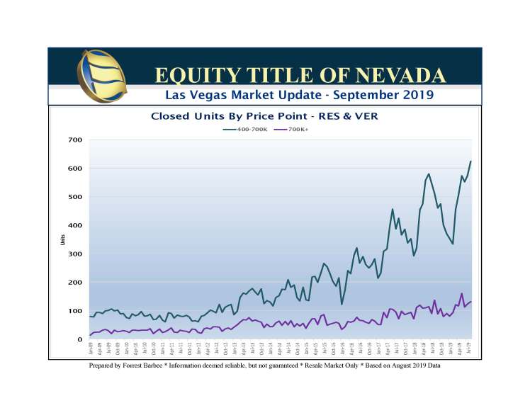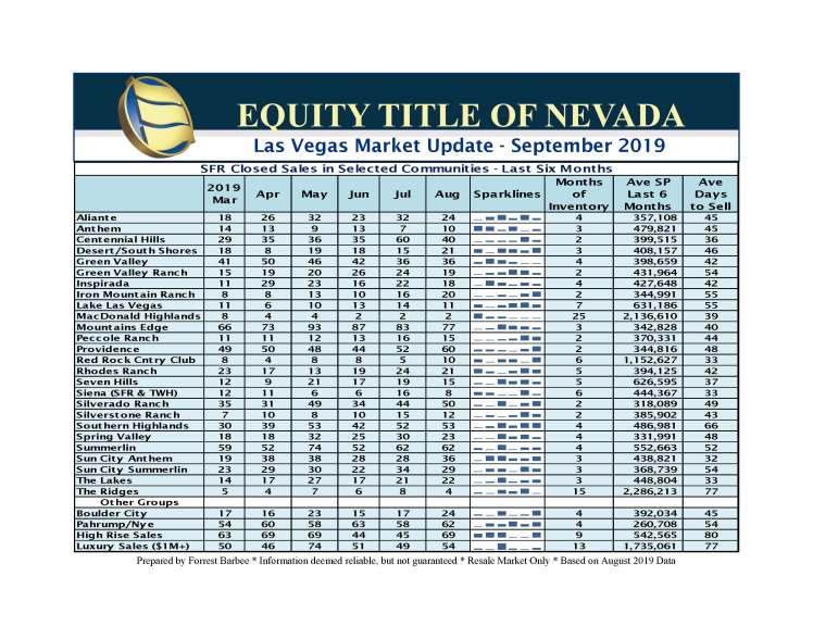 August 2019 SFR closings were flat over last month but 2.7% up from August 2018. The overall market has failed to keep pace with 2018 except for the luxury market segment which remains relatively strong . The Greater Las Vegas residential real estate market continues to lag just over 6% from last year. Meanwhile, the high rise market segment sustains its lackluster trend with no improvement in sight.