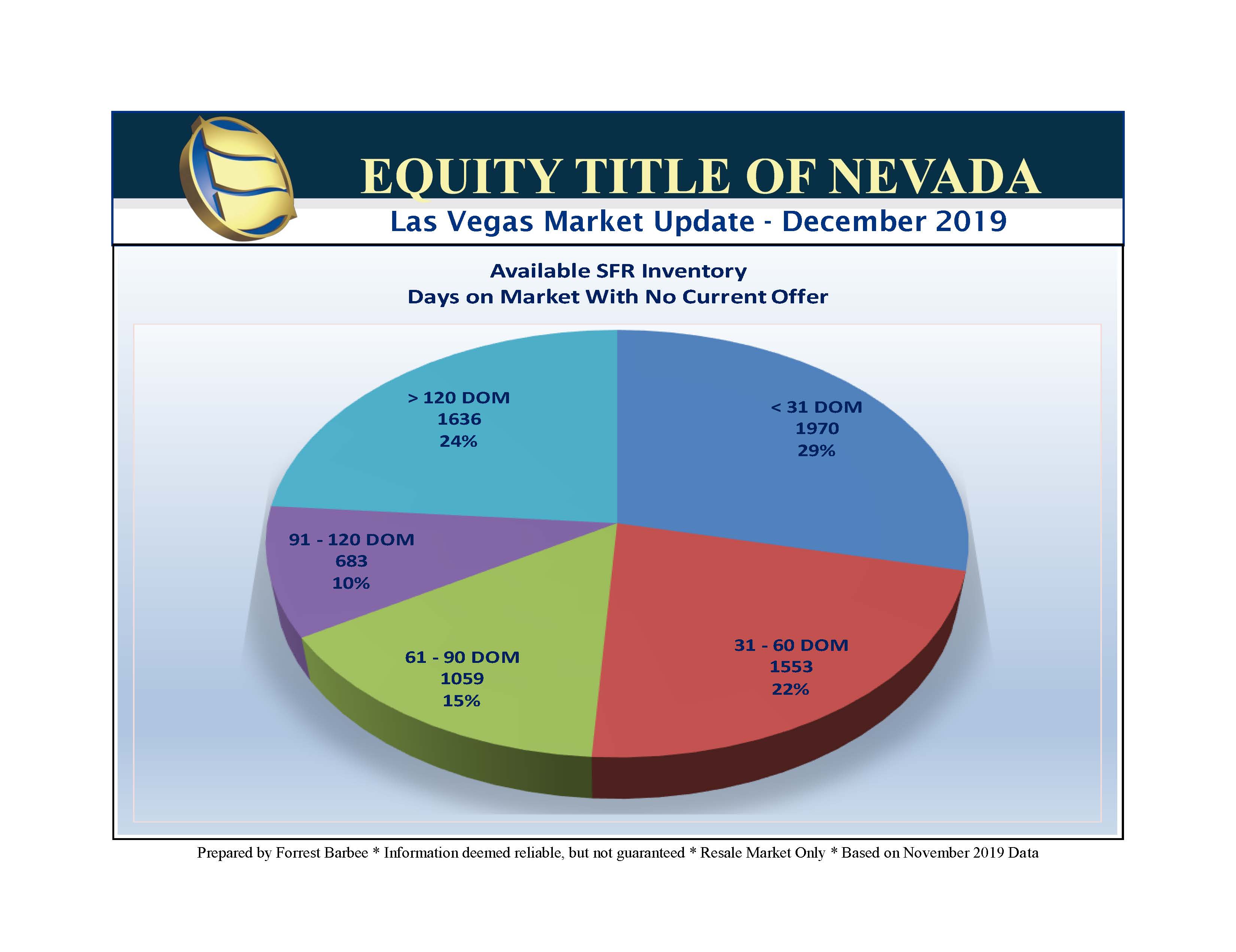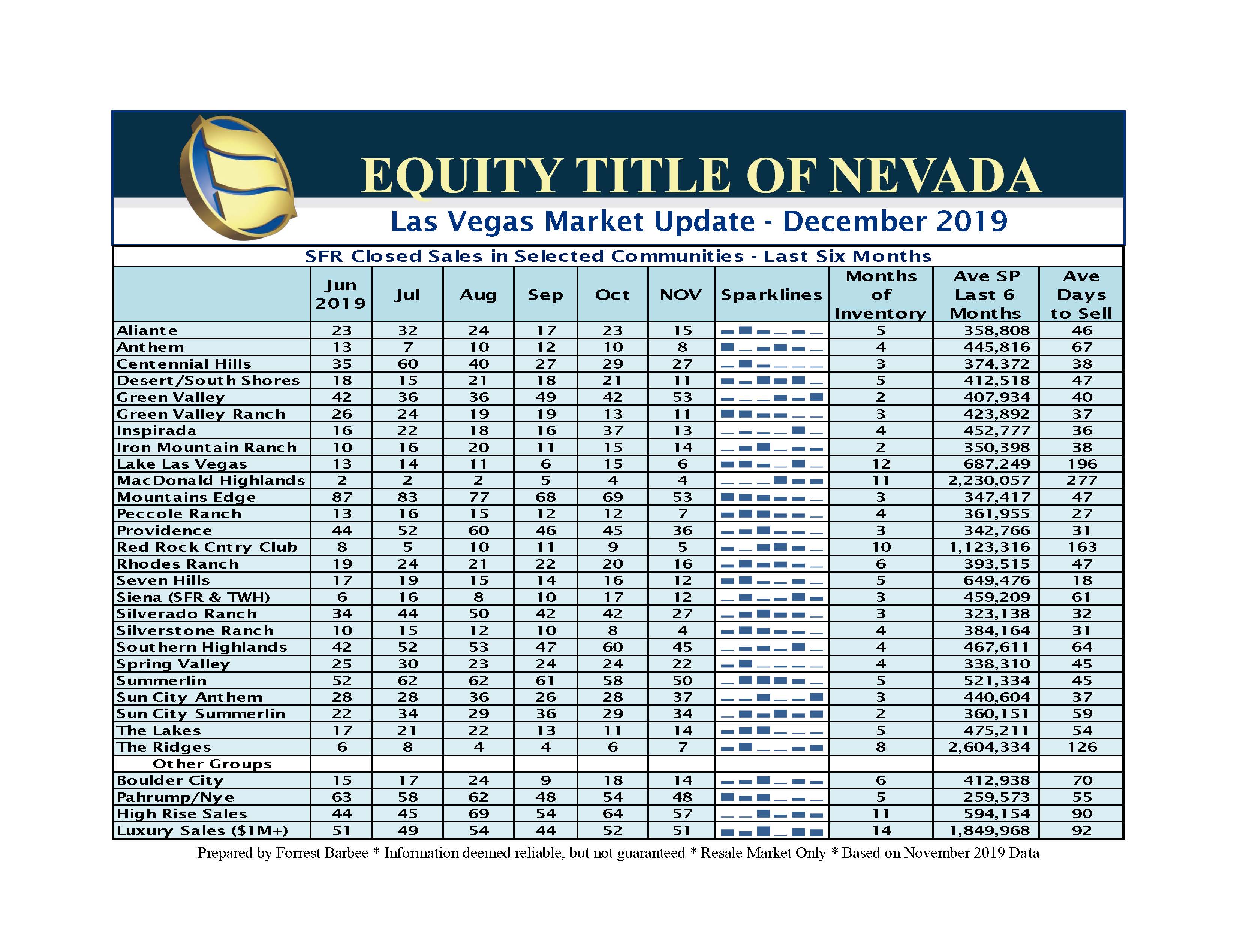 November 2019 SFR closings were down 17.5% from last month and up 4.5% up from November. The overall residential resale market (including residential, high rise, and multi-family sales) continues to improve this month and is now only 2.7% off the 2018 numbers. We are just over 39,000 resales closings year-to-date and on a pace to close between 42,000 and 43,000 resale units this year. Downward price pressures in this market have held year to date appreciation of Single Family Residential home to 5.2%. So – despite challenges with lending, appraisals and affordability issues, the Las Vegas real estate market is rebounding from a poor start to 2019 and is looking to finish stronger than we might have expected.