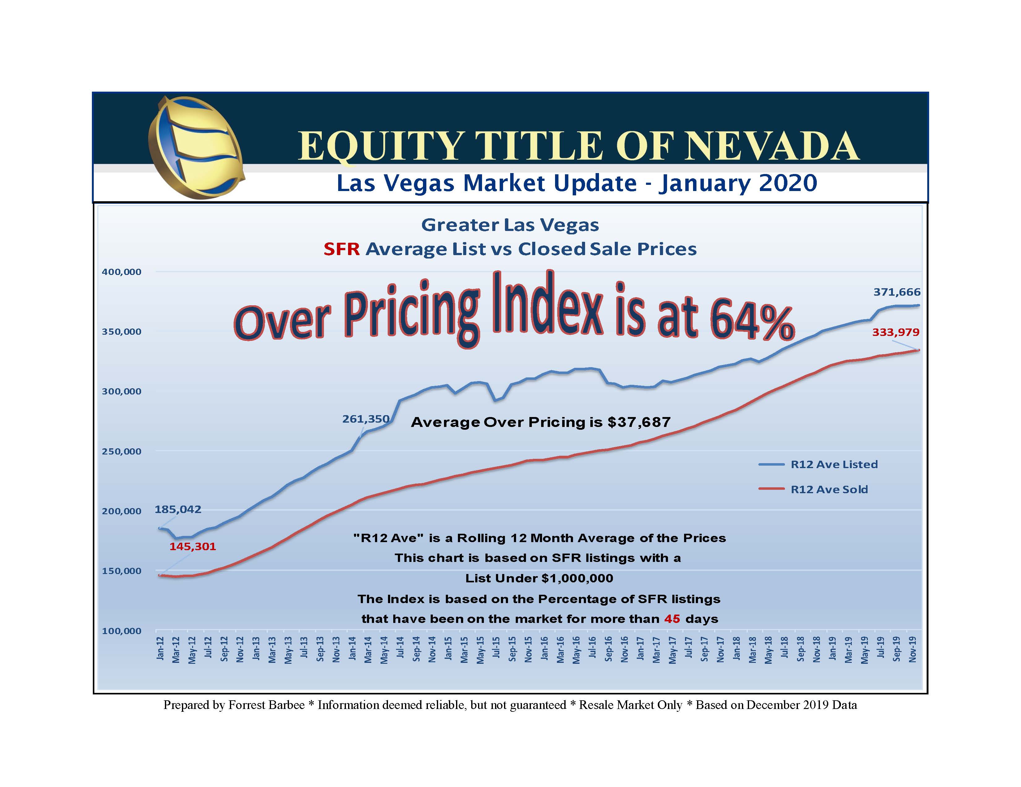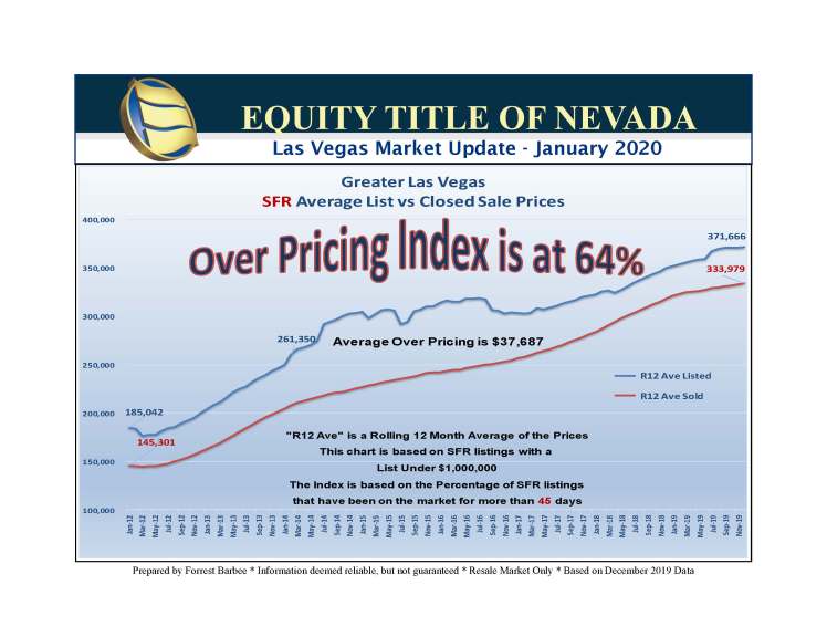 SFR inventory decreased to 2.3 months overall despite the increase in closings – primarily due to the lack of listings taken the last two months of the year. Only 2,646 residential listings were taken in December; that’s about half the listings taken in December 2018. Again, there is a wide variance from community to community – ranging from 1 to 44 months of inventory – depending upon the specific community. The level of over pricing The SFR Over Pricing Index is at 64% This index was completely updated to reflect current market conditions along with the year over year change in supply and demand. It now includes all SFR listings and closings under $1,000,000 and the Days on Market have been increased to 45 days from 30 days to better reflect the market. That was done because over 2019 the average days from list to close has increased to about 46 days. But even with this adjustment 64% of the available inventory remains over priced. Inventory priced correctly sells as expected, but improperly priced listings continue to languish on the market – even when there are multiple price reductions!