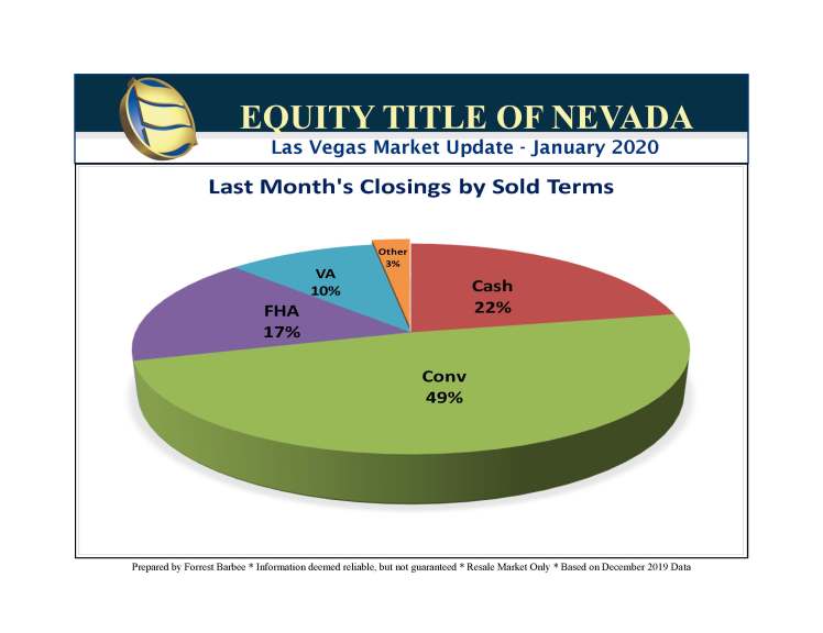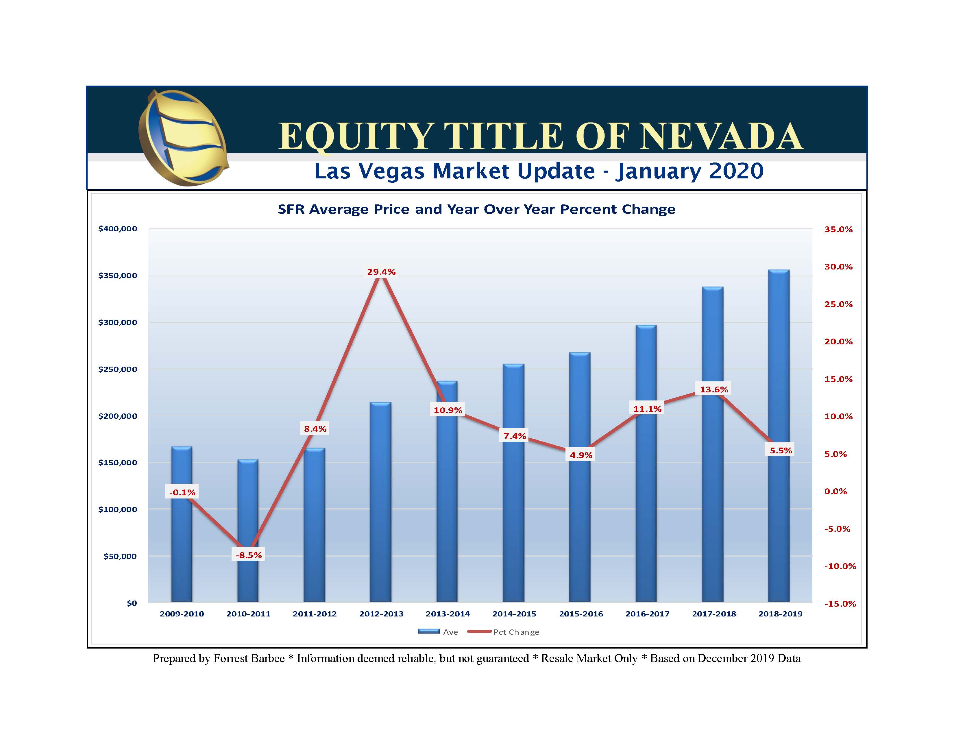 January 2019 began by falling behind 2018 by 18% right out of the gate and much of the first quarter was just as dreary! However, December 2019 SFR closings were up 7.95% from November and up 21.14% up from December 2018. The overall residential resale market (including residential, high rise, and multi-family sales) closed out 2019 by being off only 1.25% from the 2018 numbers with just over 42,000 resales closings for the year. Overall 2019 market appreciation for Single Family Residential (SFR) homes was held to 5.5% over 2018. So – despite a poor start and challenges with lending, appraisals and affordability issues, the Las Vegas real estate market is rebounded quite nicely with some momentum to take us into 2020.
