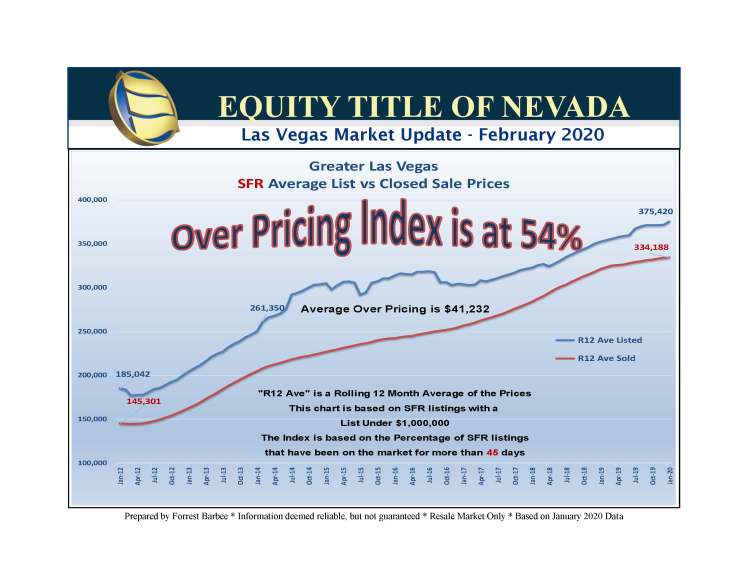 The level of over pricing The SFR Over Pricing Index dropped to 54% This is due in part to many older listings finally selling at the same time that a very large batch of new listings hit the market! But note that the average amount that each SFR is overpriced increased by nearly $4,000.