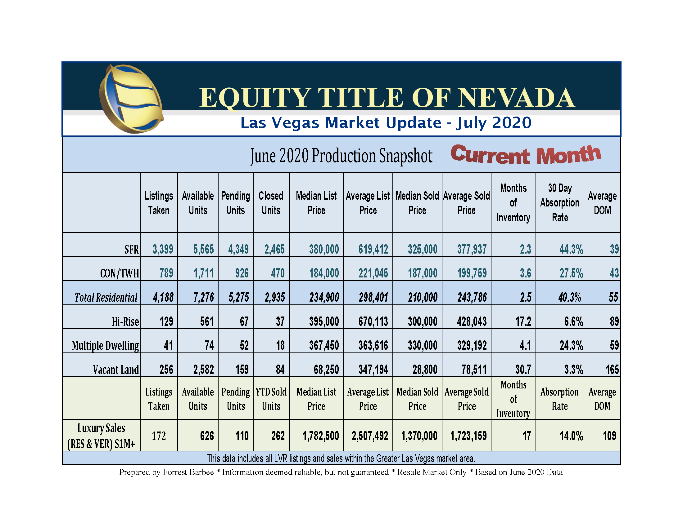 2020 residential closings remain 13.2% behind 2019 as a result of the pandemic but the market has already begun rebounding! Meanwhile, SFR inventory dropped dramatically to 2.3 months overall based on the market shift of supply and demand and the lack of new listings taken. There were 4,188 residential listings taken in June which is nearly the same as in May (4,124). However, residential closings were up 41.4% month over month! So there’s really only about 1 month of marketable inventory because 53% of all SFR homes are listed well above what the market will bear! It’s time to send out an APB to find more listing agents to help replenish and build up the supply of available homes for sale!