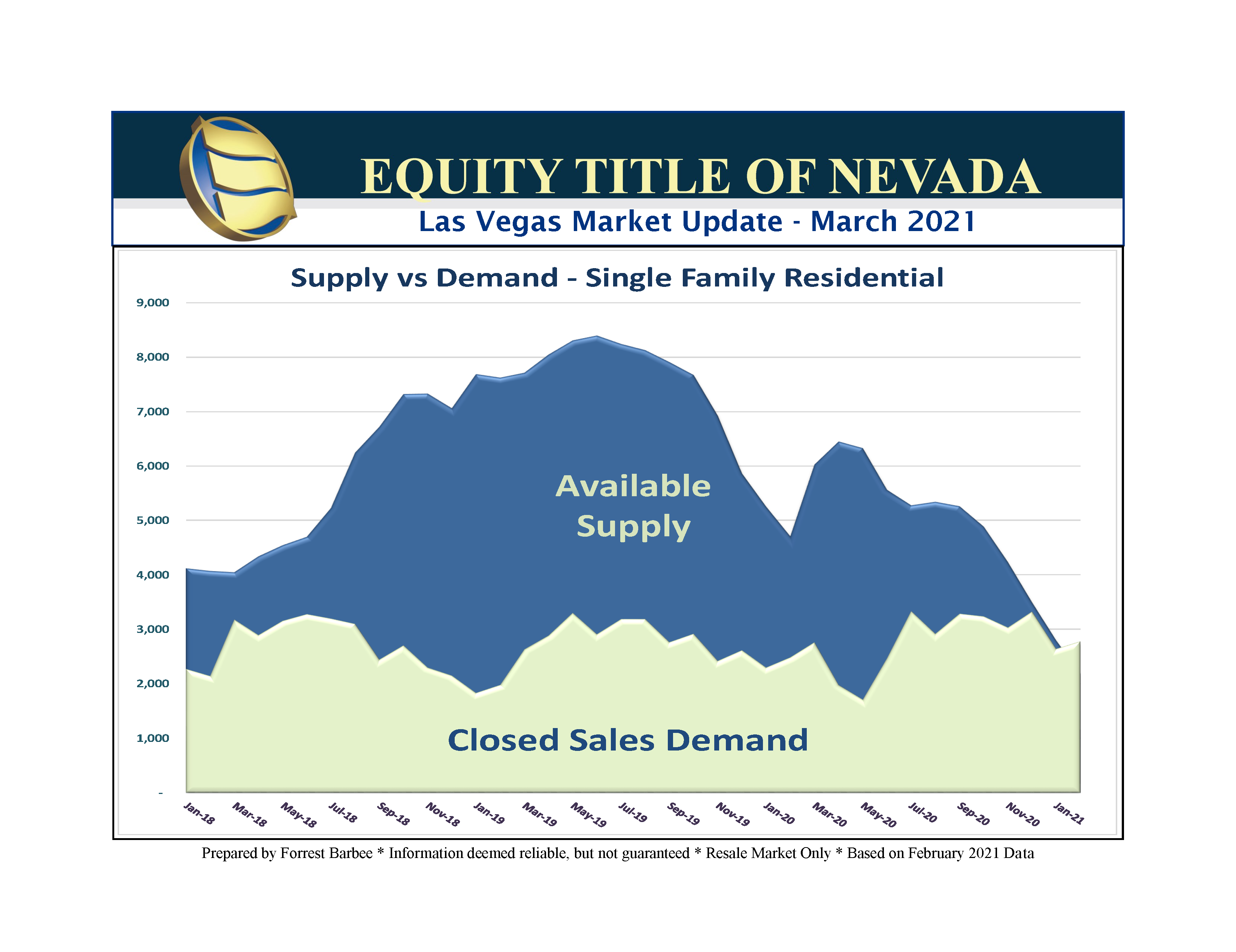 But let’s talk inventory! February listing agents added just under 200 more listings to inventory than in January, but Greater Las Vegas offers over 800 fewer available listings than last month. The available supply of SFR inventory is down 36% from this time last year and is now less than demand based on this month’s closings. Multiple offers are the norm with less than one months supply of inventory – and even less in some communities.