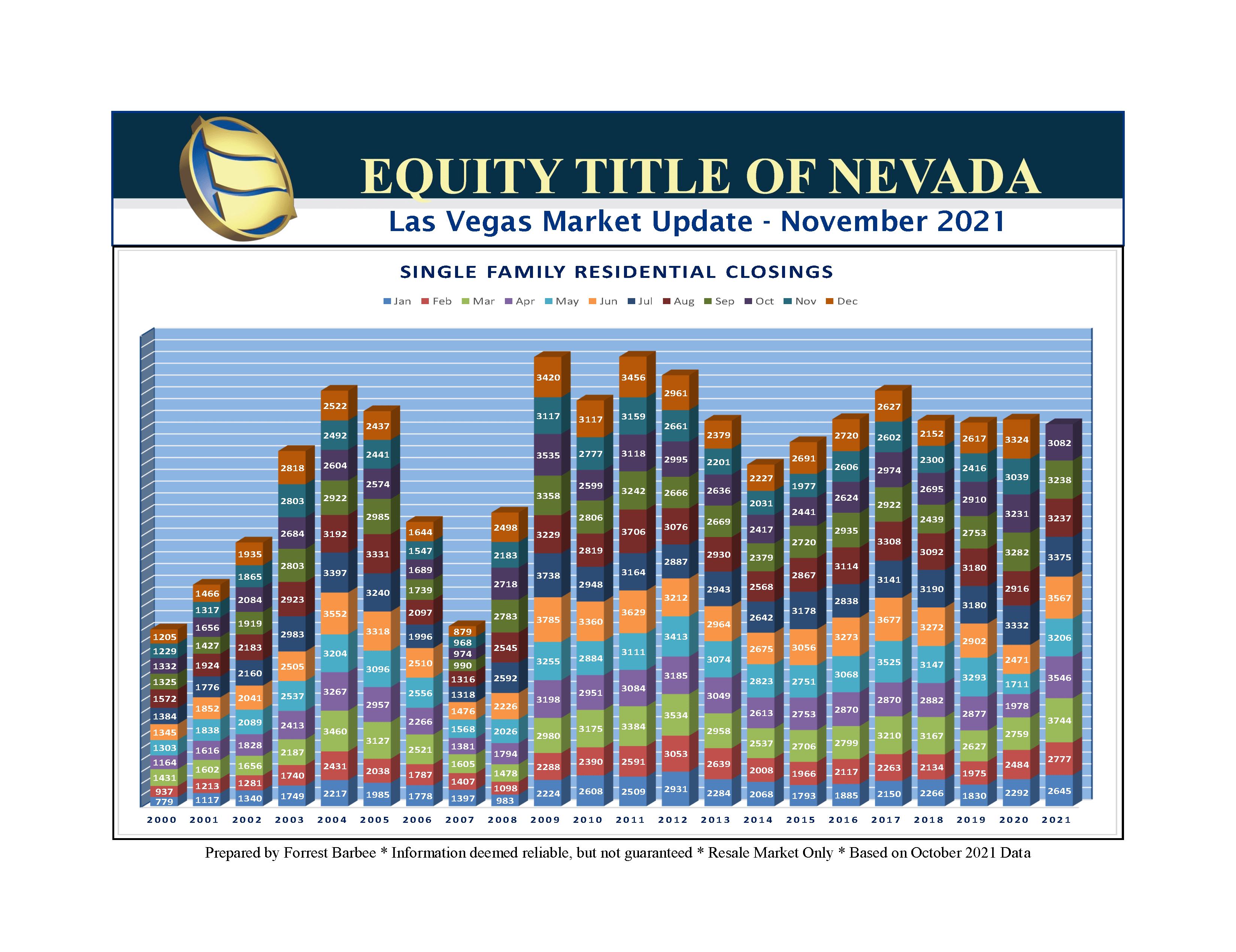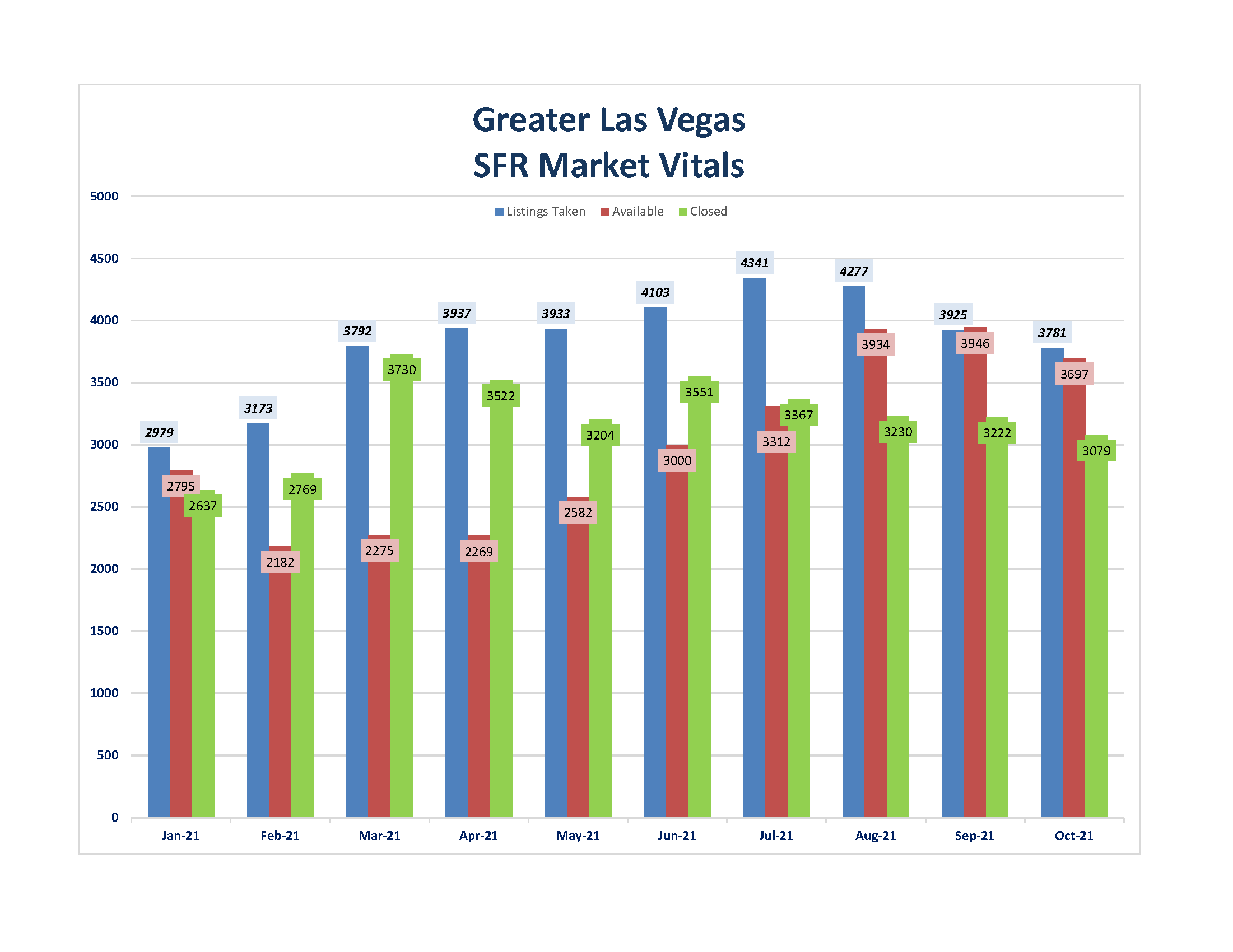 The 2021 residential resale market pace slowed somewhat in October. Listings taken were down in October as are the overall number of available listings. Demand remained steady although there were approximately 260 fewer closings in October as compared to September. That leaves Greater Las Vegas hovering at 1.2 months of SFR inventory.