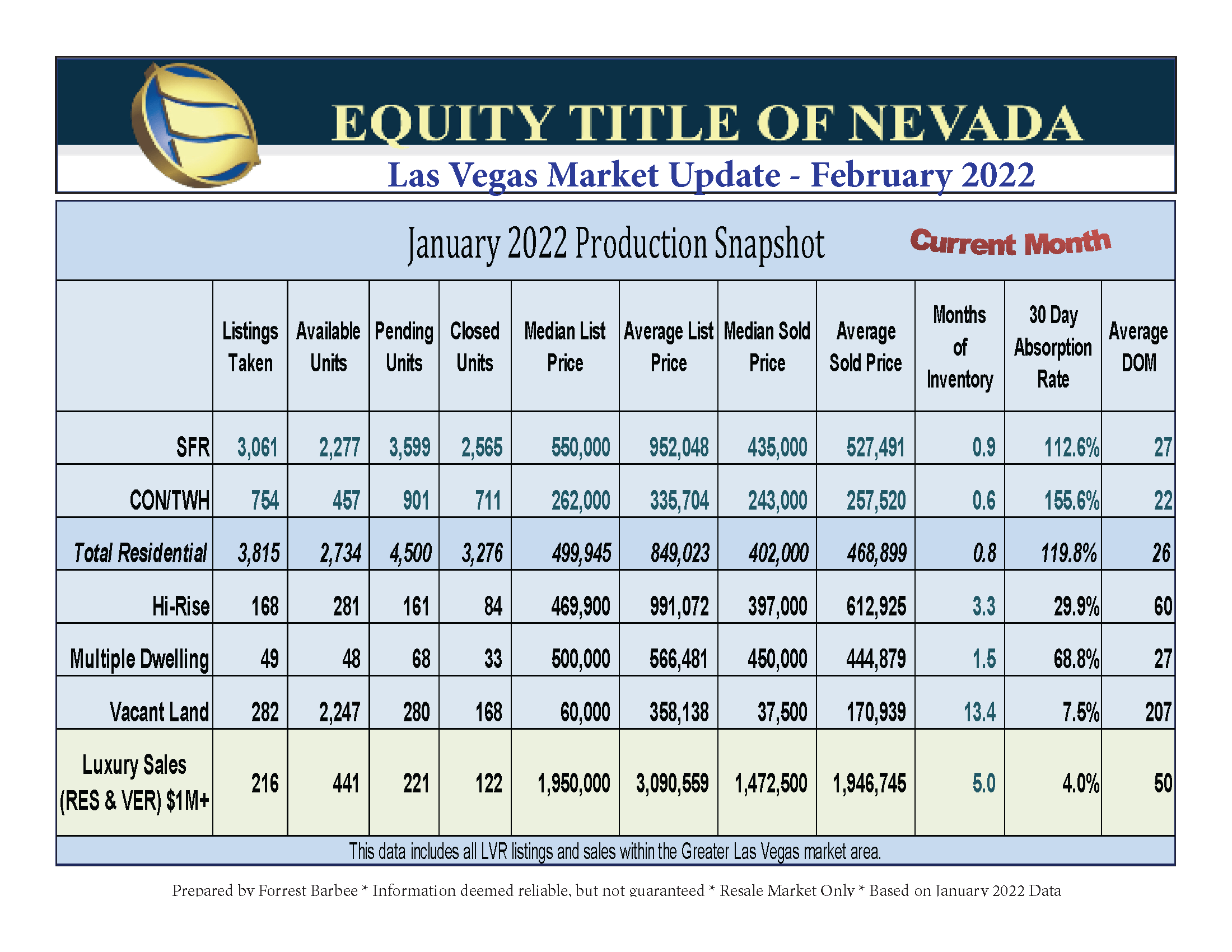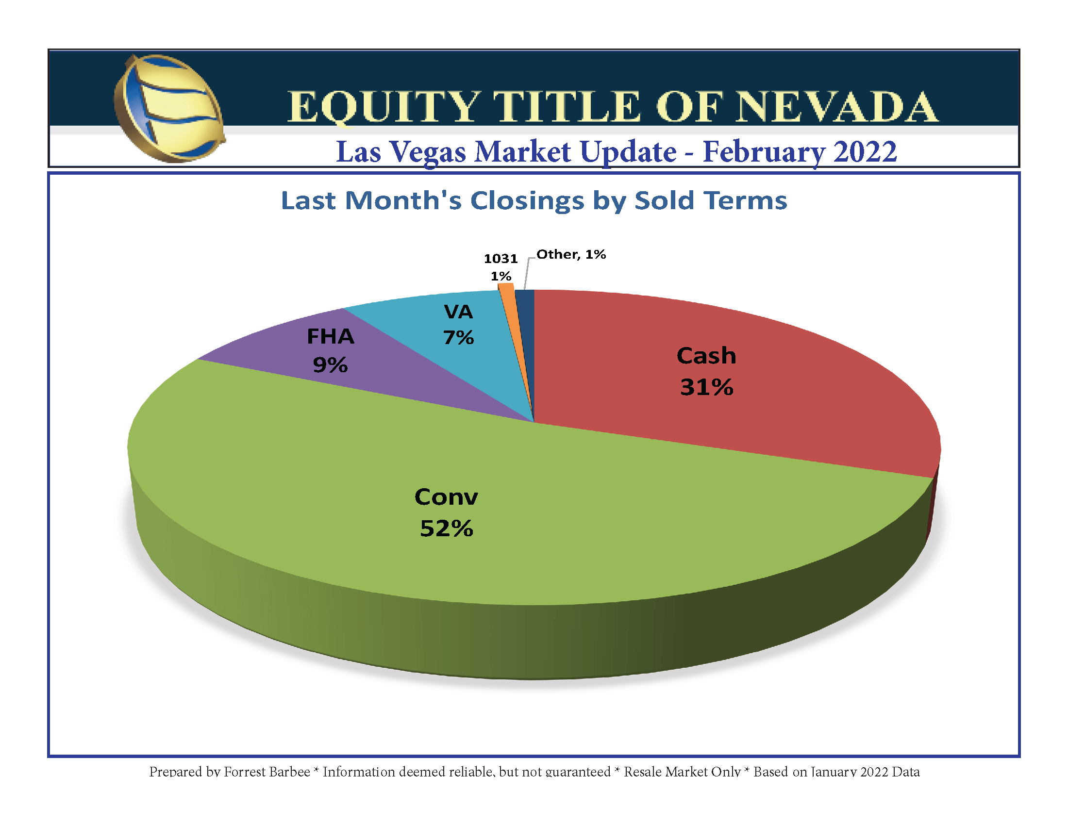 One year ago 23% of the closed units were under $250,000 and 76% of all residential closed sales units were below $400,000. Fast forward to January 2022 and notice that only 14% of all closings are below $250,000 with closings below $400,000 have shrunk to only 50% of the Las Vegas market closings. This sheds light on why there are more cash transactions again in this part of the market.