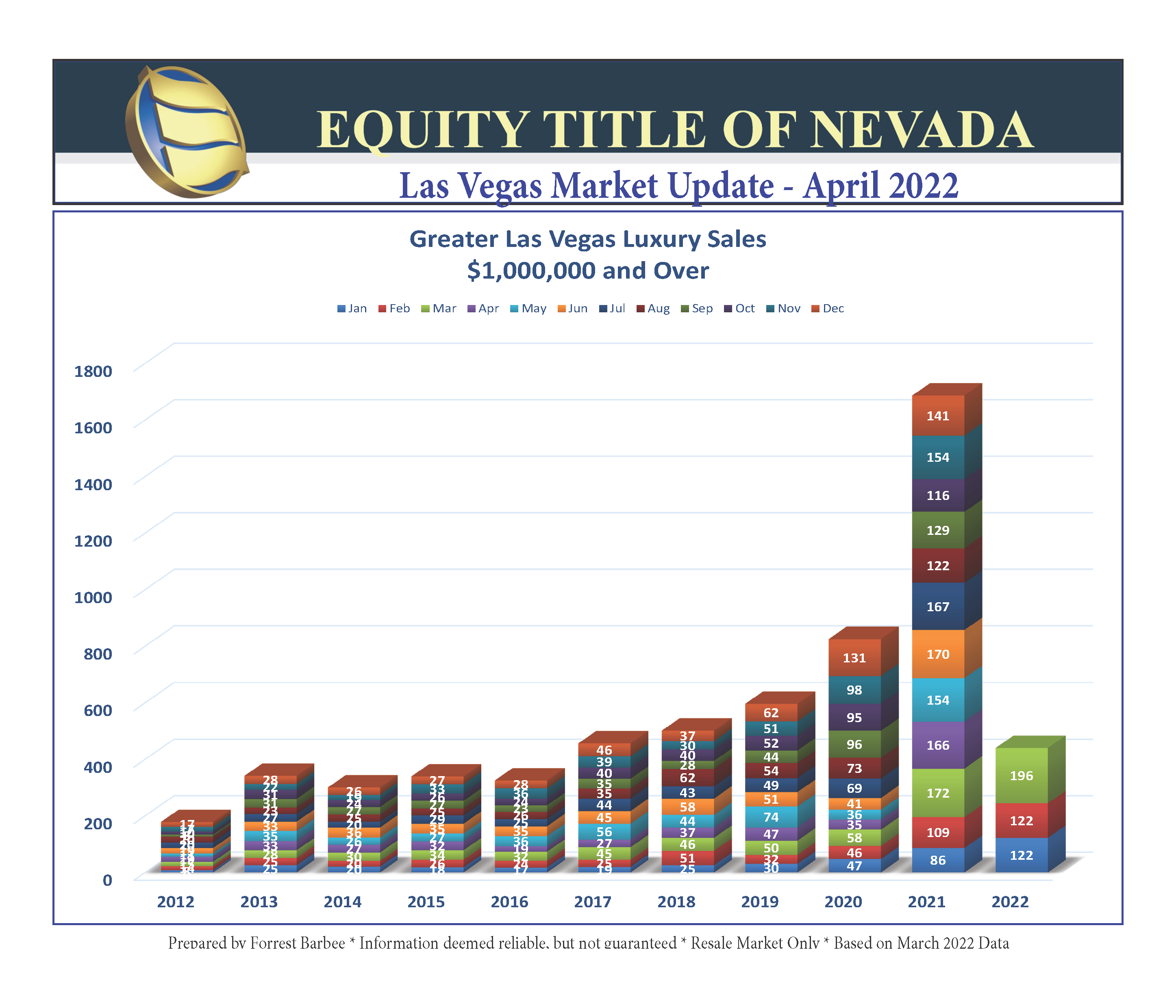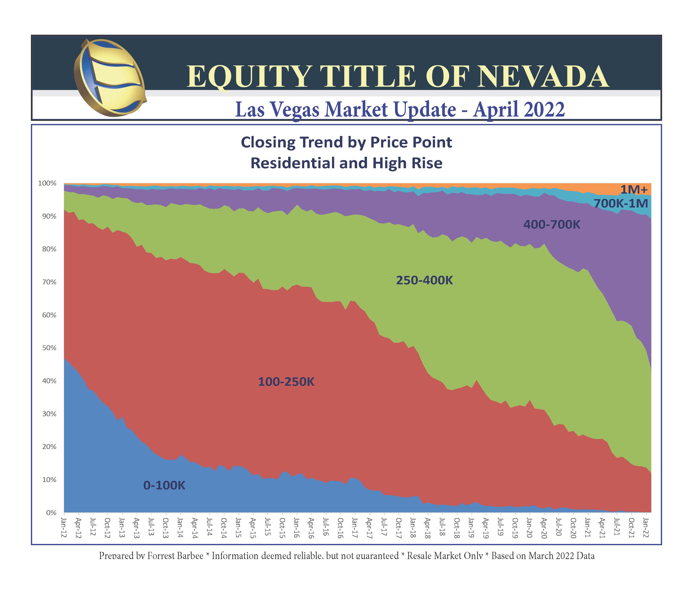 It’s incredible to look backward and realize that in January 2012 almost 50% of the Greater Las Vegas residential closings were below $100,000. Closings below $250,000 made up over 90% of that market. Today that some price point ($0 – $250,000) makes up less than 20% of residential market closings. Another 75% of current market residential closings is comprised of sales between $250,000 and $700,000. One can easily see the recent shift in the market closings above $700,000 as well. We will be keeping an eye on this chart as we navigate 2022!
