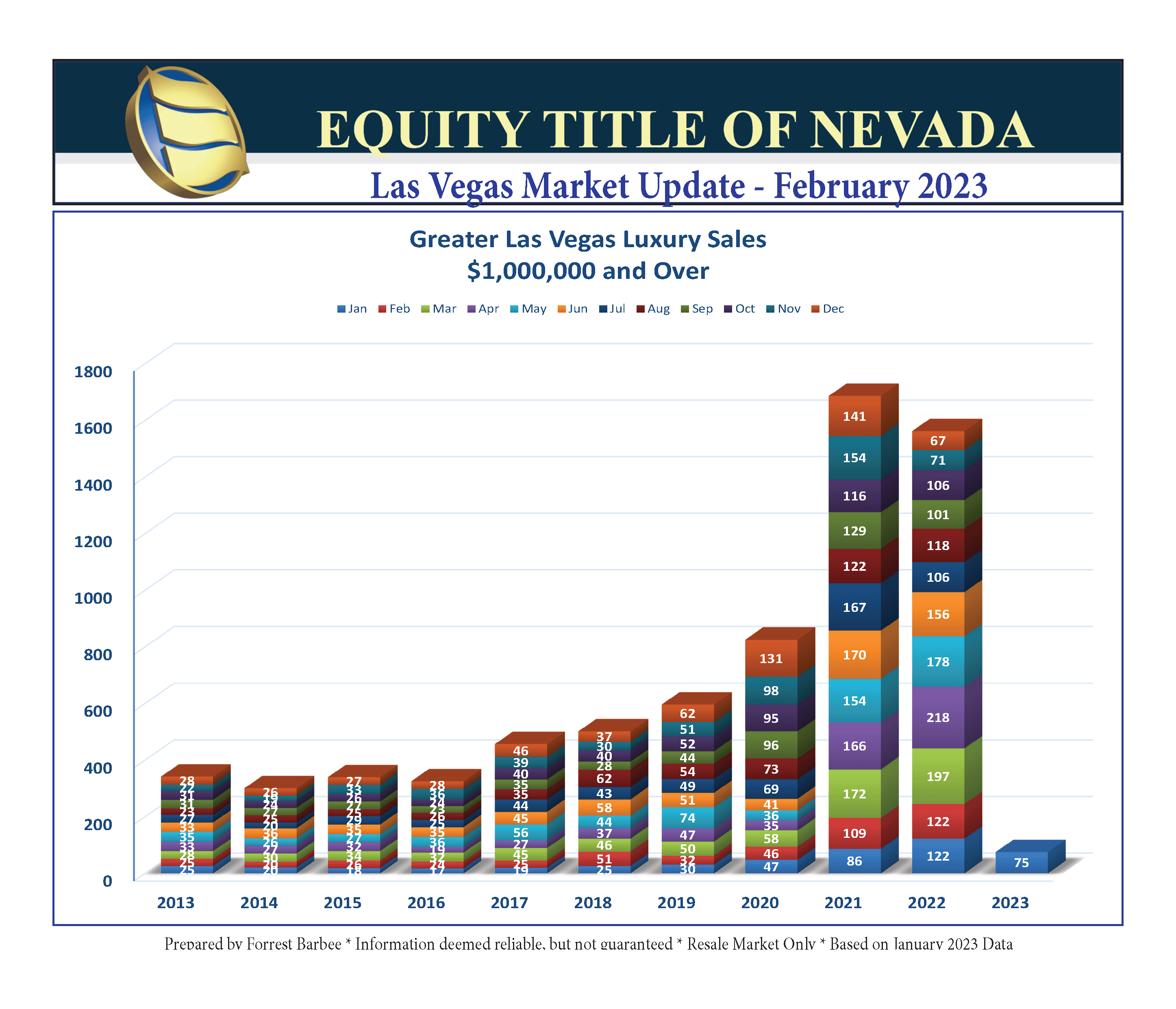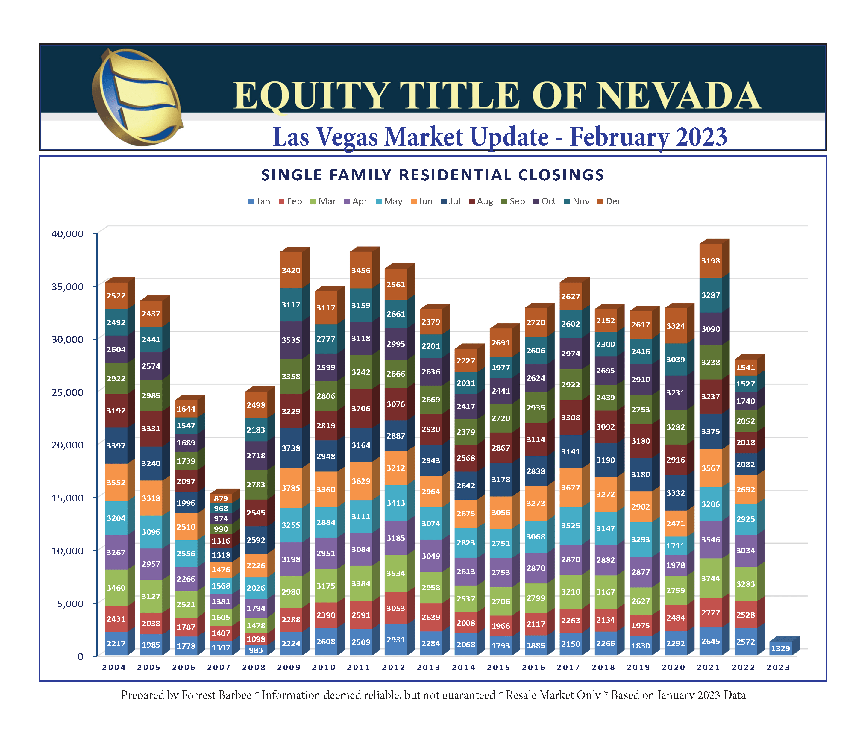 2023 is off to an auspicious start! January SFR closing were only 1,329 units, which is 48% behind January 2022 and the worst start to any Greater Las Vegas residential real estate year since 2008. However, it seems that the activity increased during the last week or so of January. Listings taken are up even as available listings and homes in escrow remain down. There are right at six months of inventory for SFR listings, but it ranges from 3 months to 16 months – depending on the community.