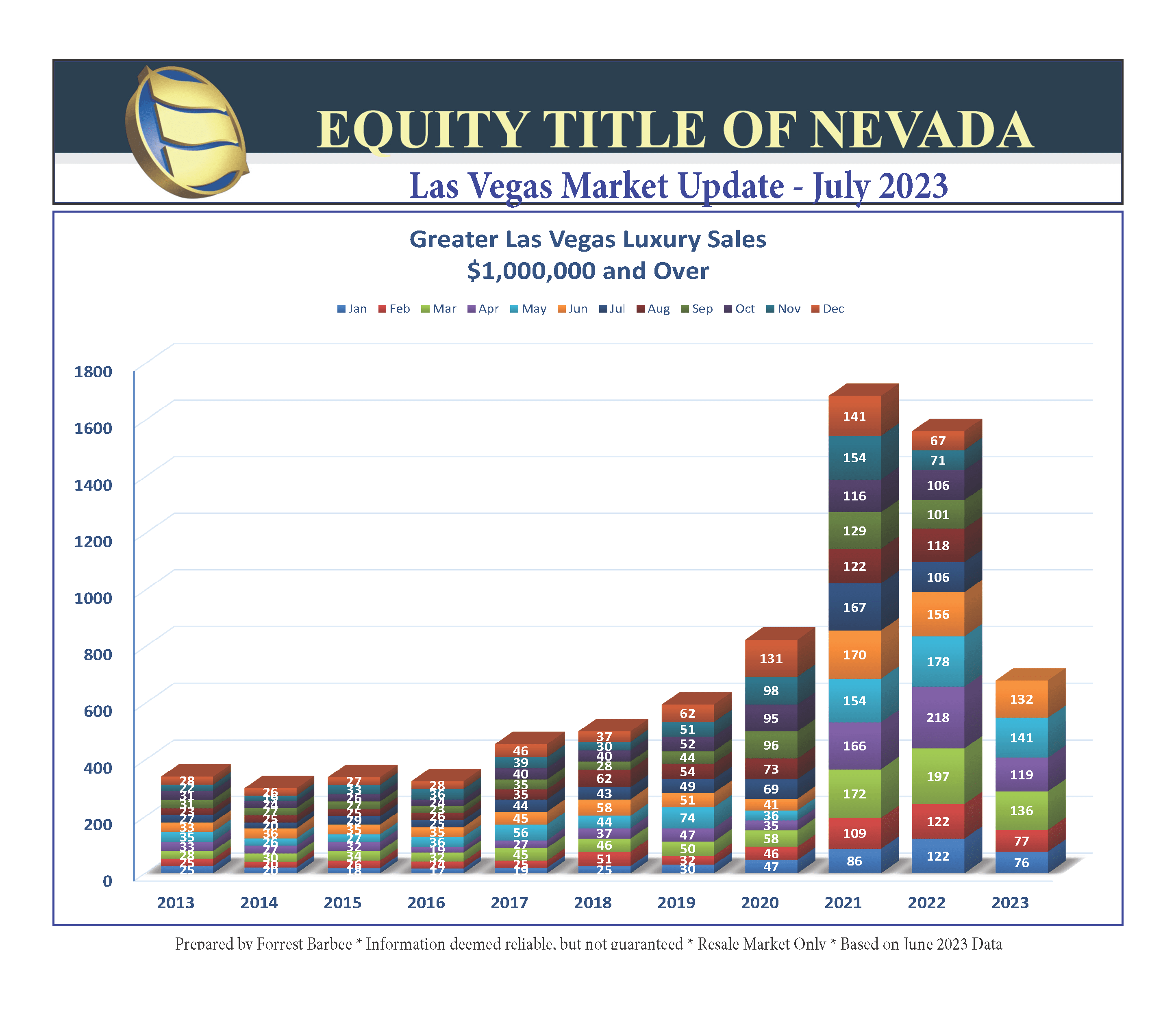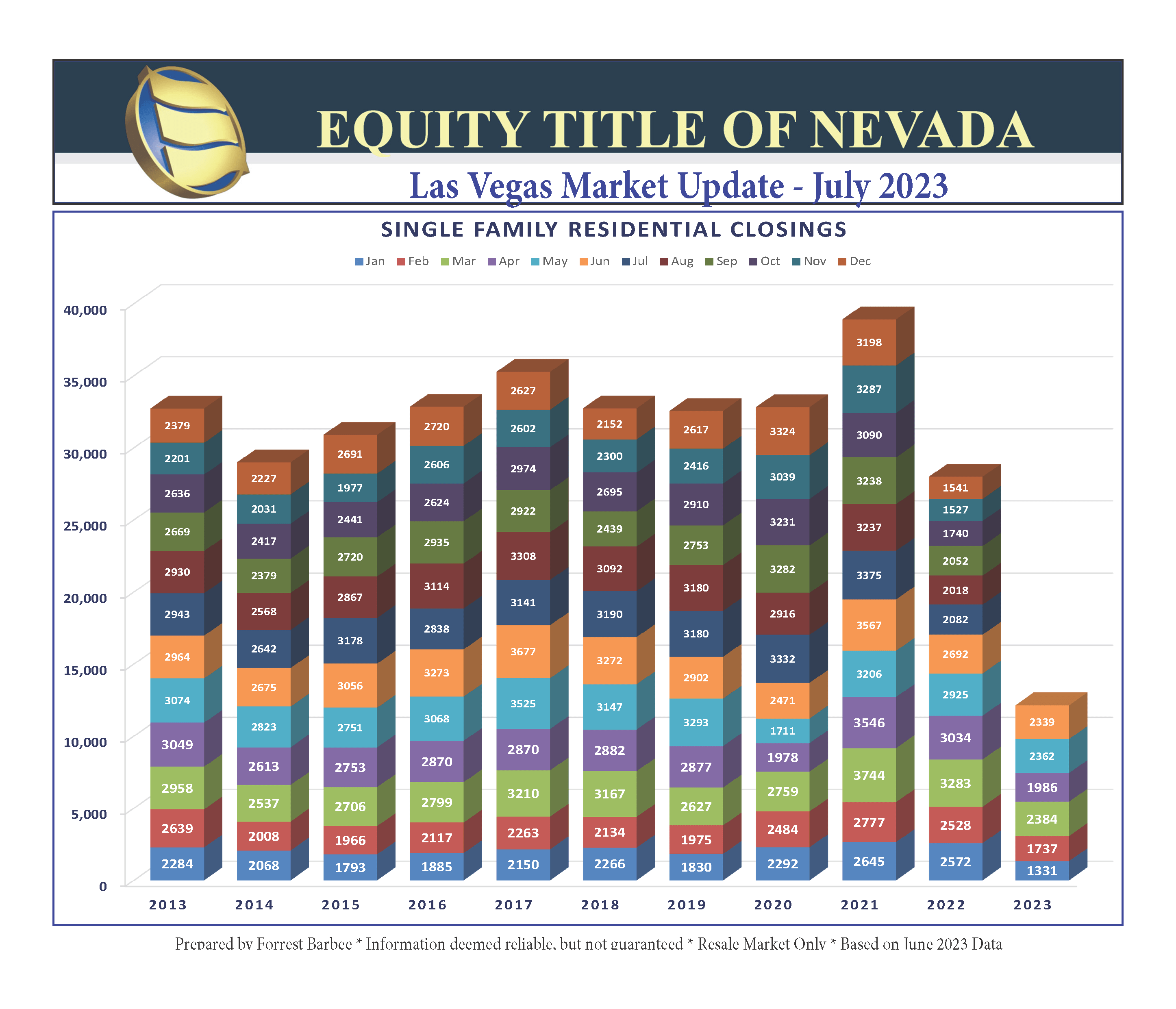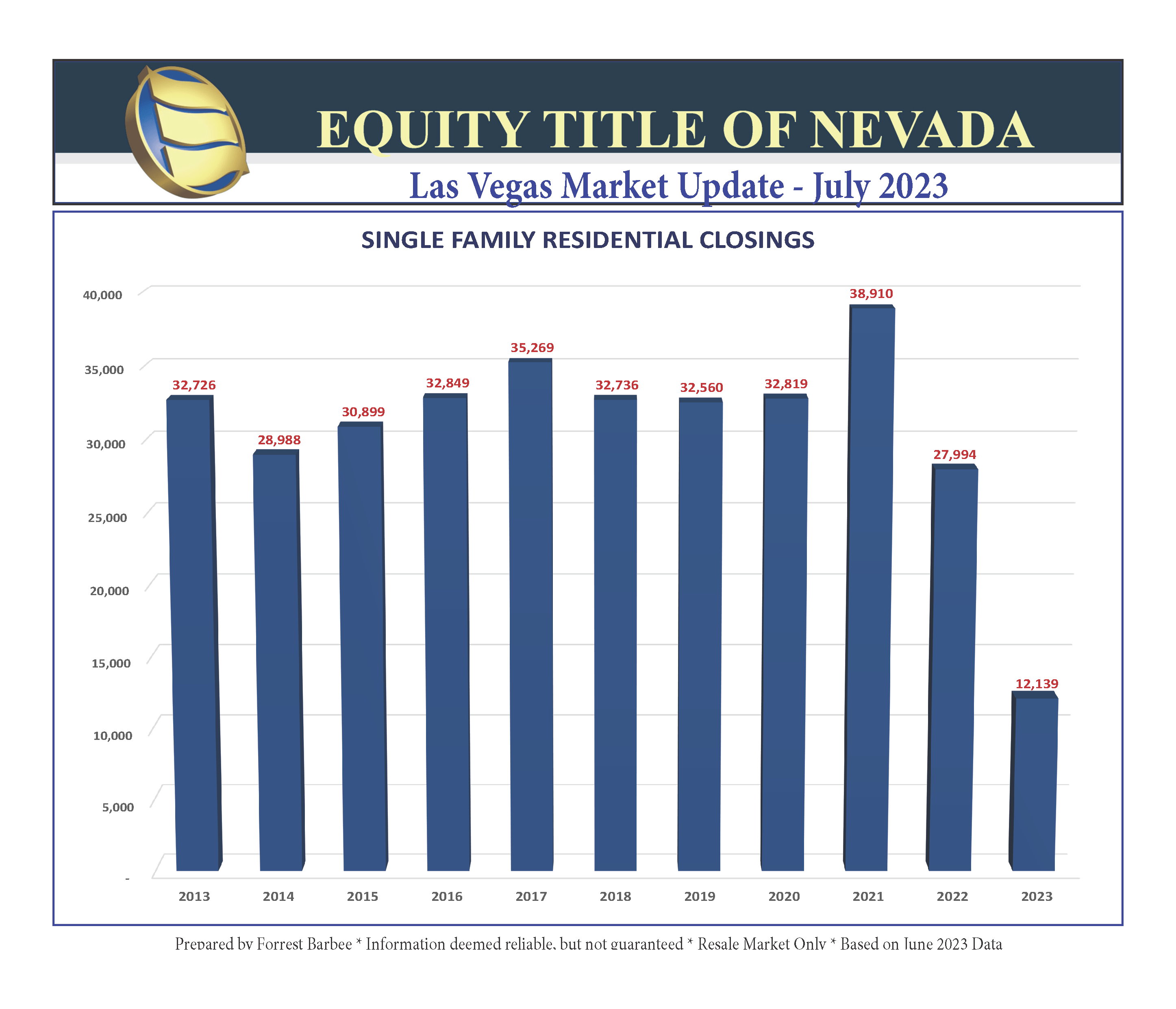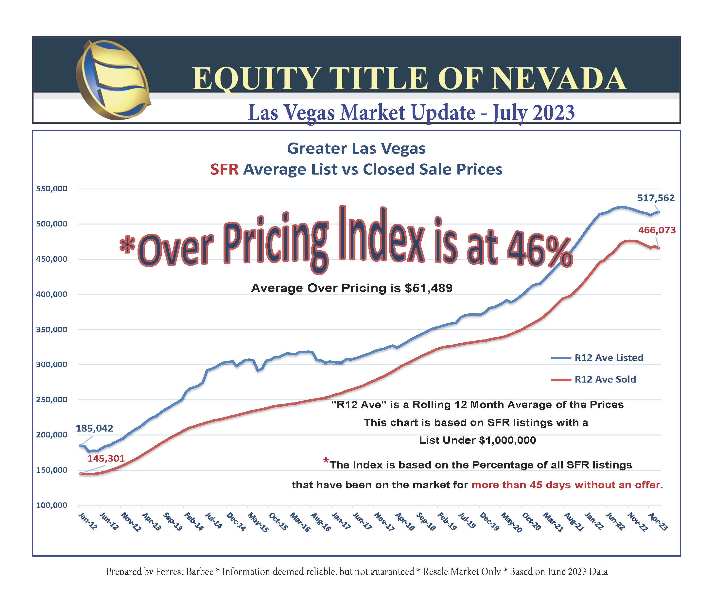 First . . . my numbers are a little different than LVR. They took their snapshot on 7/5/2023 but most agents did not have end of month June closing packages until yesterday or today – so I held off. And some high-end sales closed in the last couple of days in June that just showed up. Consequently, the median price remained flat at $445,000 even though the average closed sales price of an SFR dropped from $562,023 to $546,426. Actual closings were flat and consisted of a higher proportion of cash sales. New listings were flat for June while available and pended listings have both dropped a bit. That means we have a healthier three months of inventory, but both buyers and sellers are a bit more nervous due to “all the stuff” going on in the economy. If there was ever a market in need of aggressive 3 and 5 year ARMS – it’s this one!!