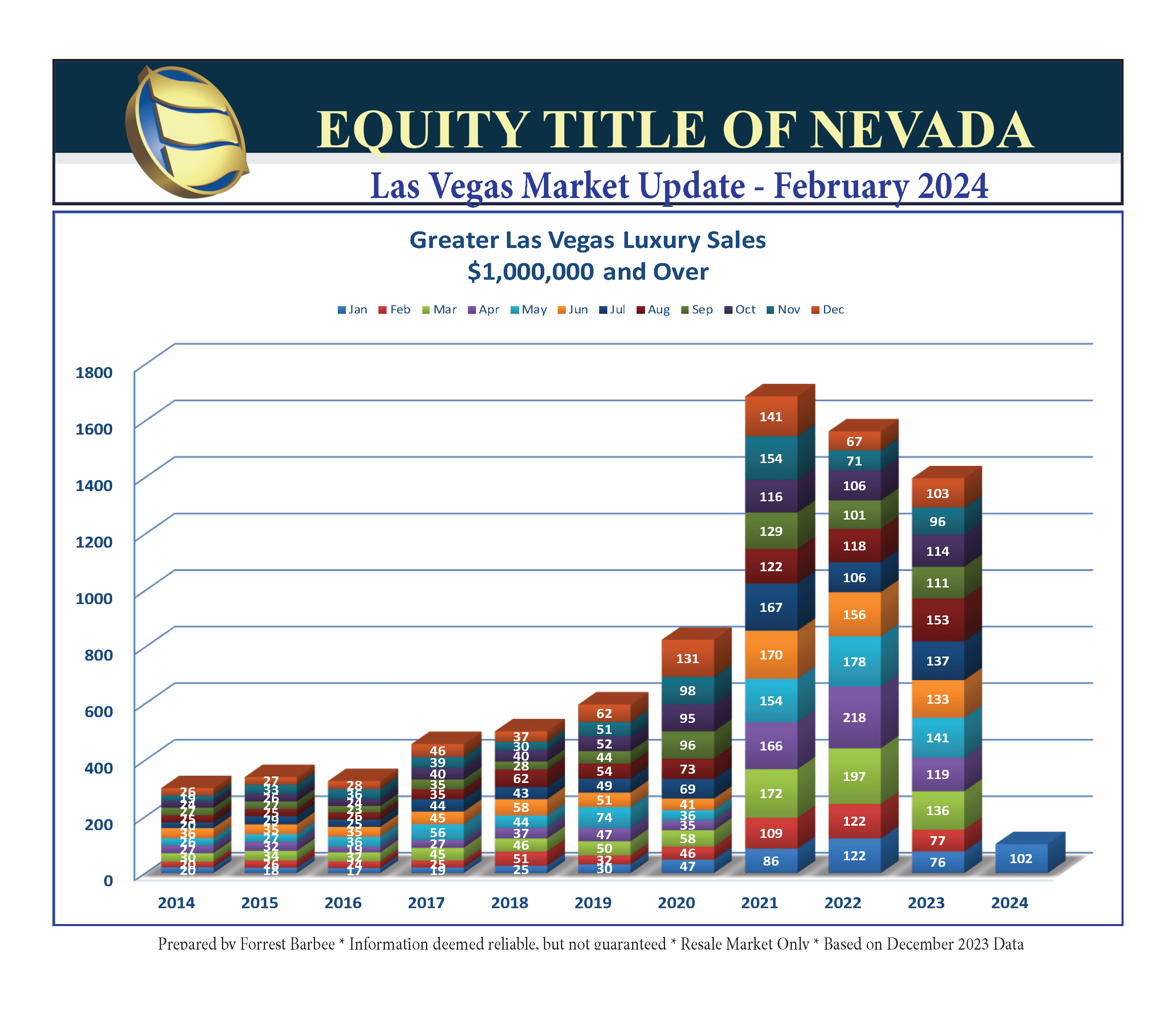 The 2024 Greater Las Vegas real estate market is off to a good start with closed units up 14% over January 2023 and closed volume up 24% over last January. It also appears that our listing agents have returned from the Winter holidays fully recharged as they took 1.000 more listings in January than in December. However, with demand remaining steady, we still only have 3.5 – 4 months of inventory. Pendings jumped approximately 600 units. All of this activity contributed to a significant reduction in overpriced inventory.