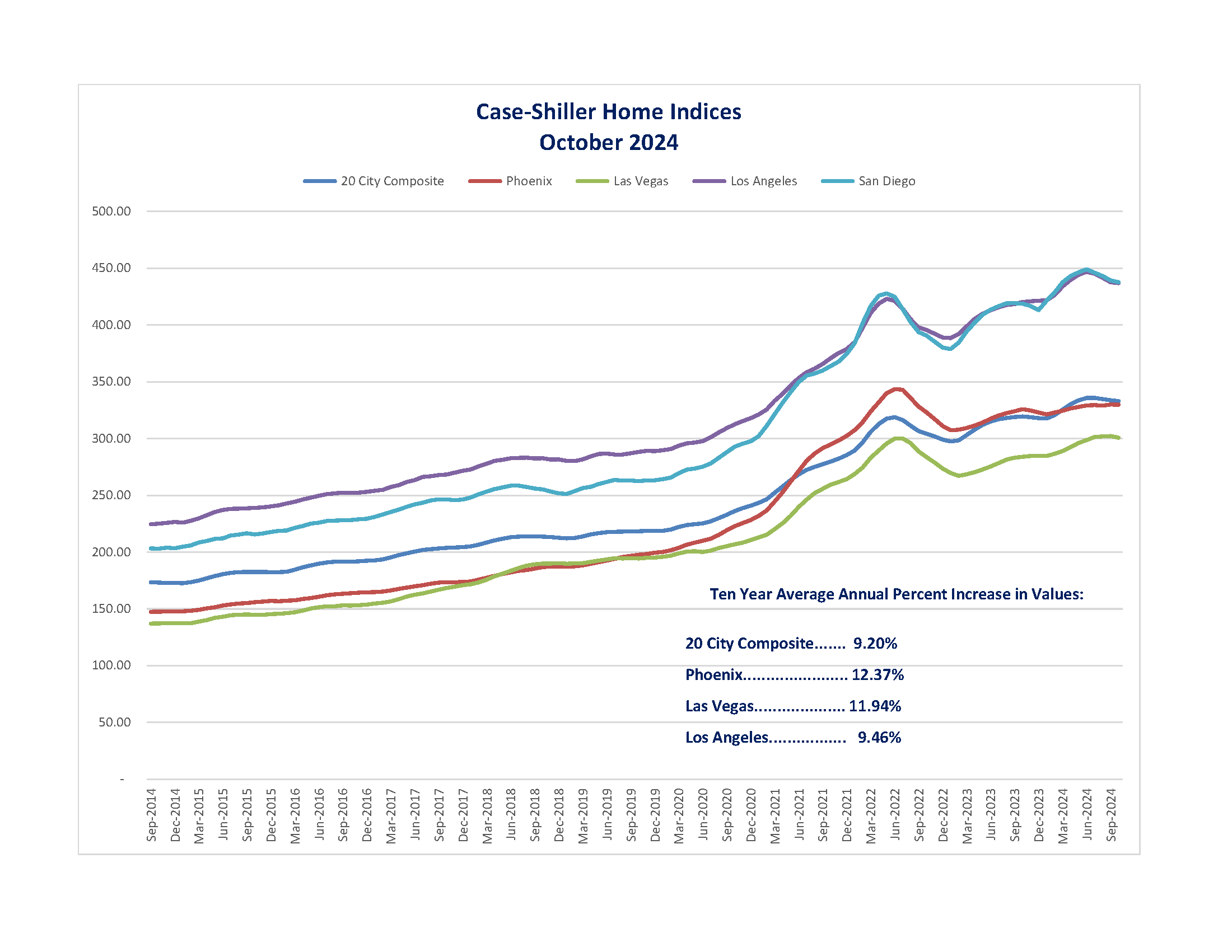 Please not the first chart below which depicts the Standard and Poor’s Case-Shiller home indices for the past ten years as of October. Case-Shiller is always 3 months in lag of the market, but even by October we can see a very stable market even with a bit of leveling off. There’s every reason to believe that a modest uptick is quite possible in the next few months.